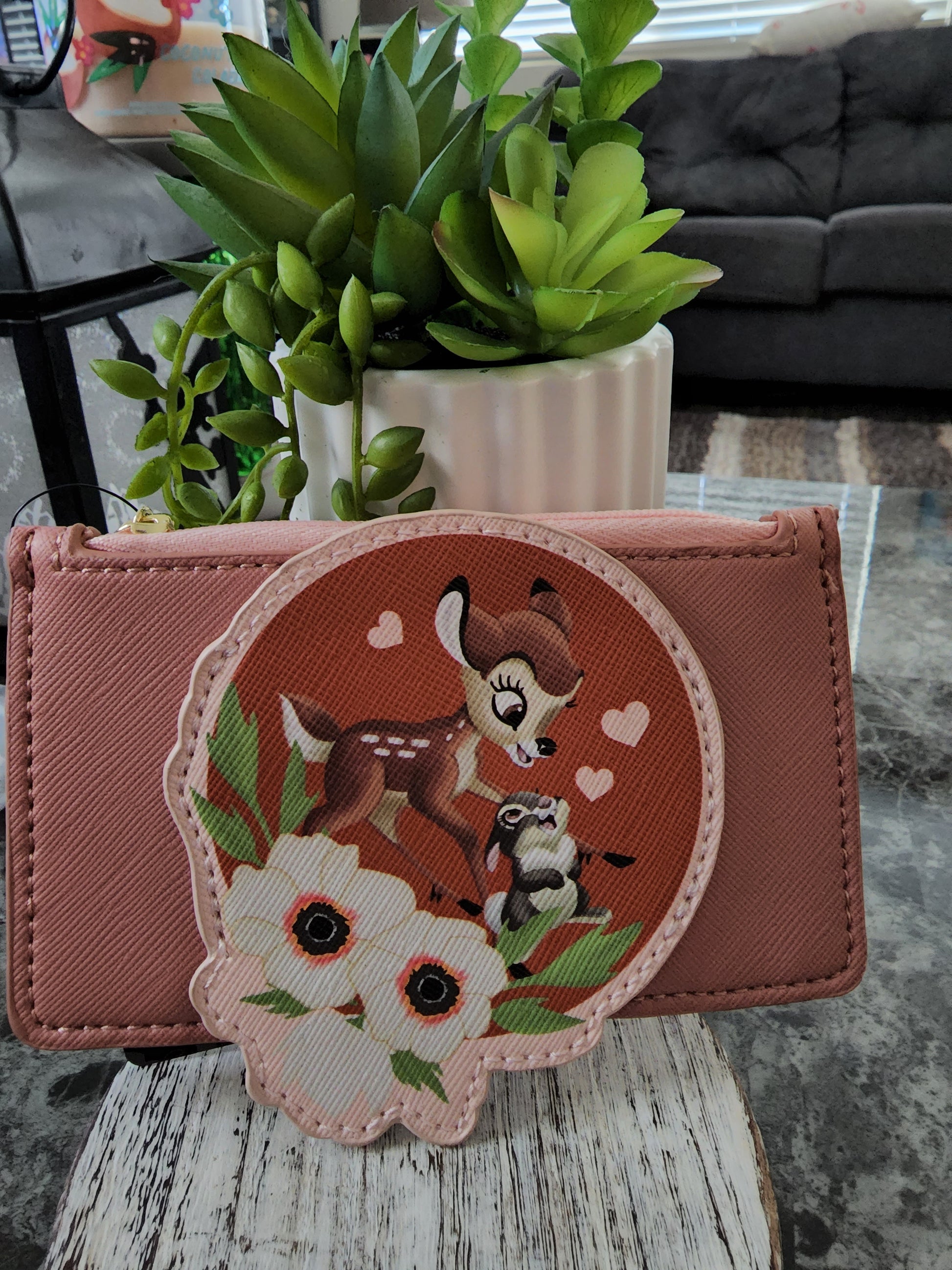 Awesome Loungefly Disney Bambi card holder. It has slots for credit cards and a zipper pocket for bills and coins.