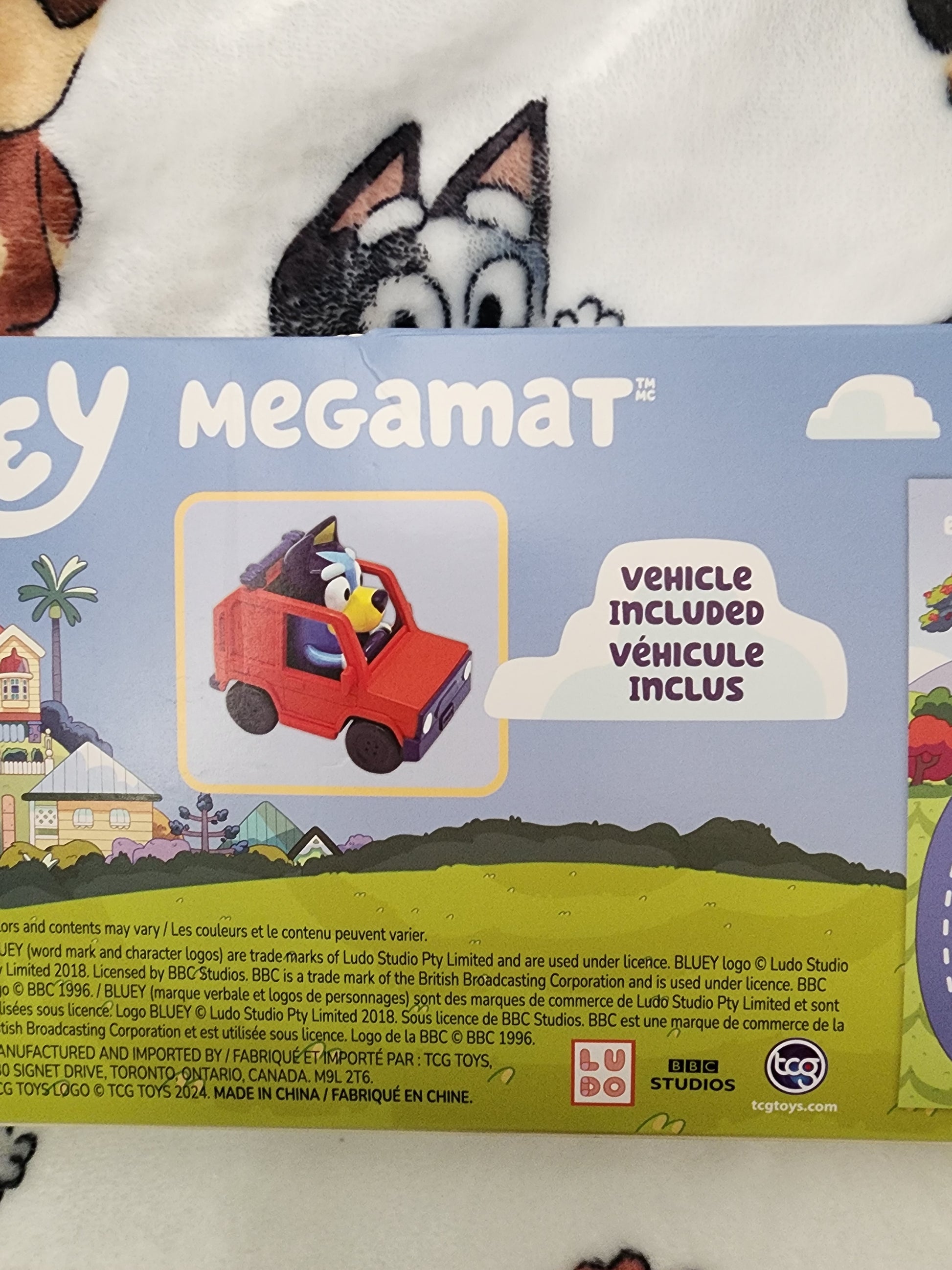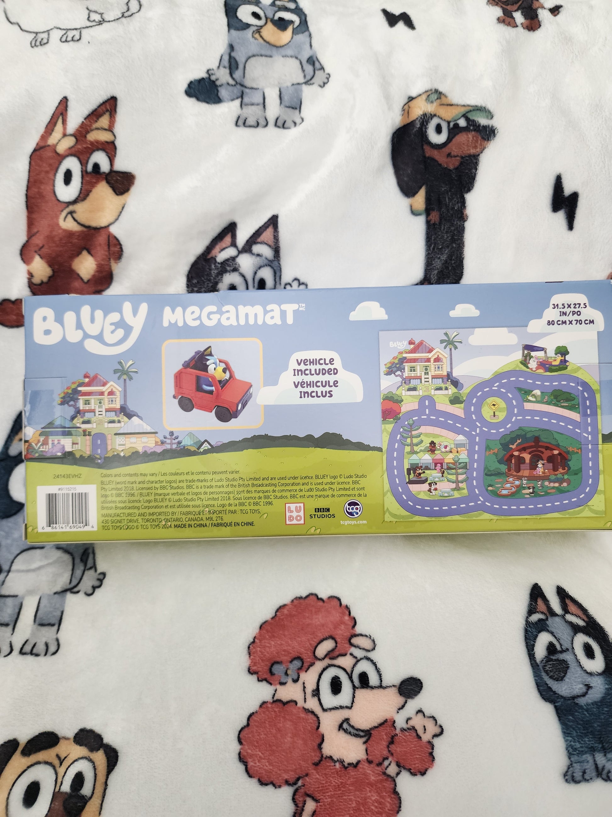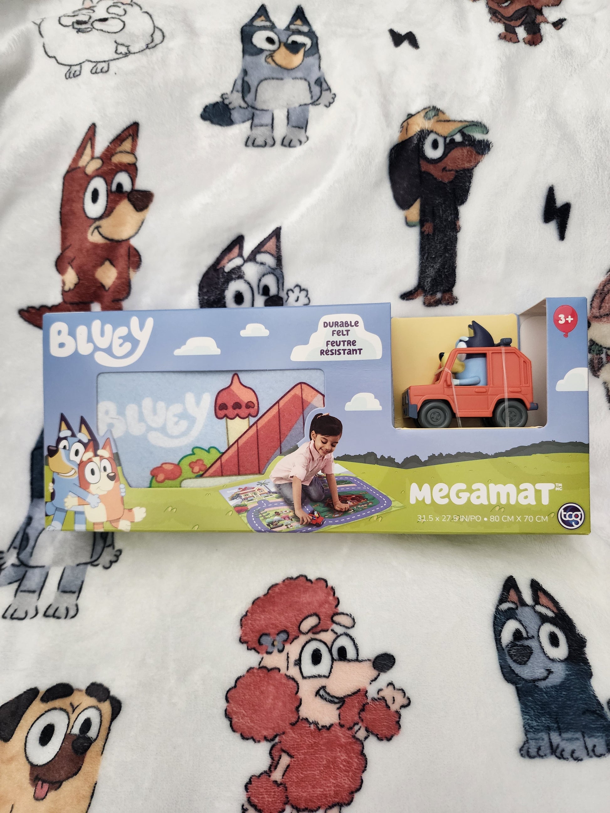 Super Cool and fun for the kids to enjoy hours of play. It is a Bluey Kids Play mat 31 1/2" X 27 1/2" play area. It comes with a car and Bluey is driving. The mat has all of Bluey's Friends on it and Bluey's house and a road to drive the car on. Your kids are going to love this mat.