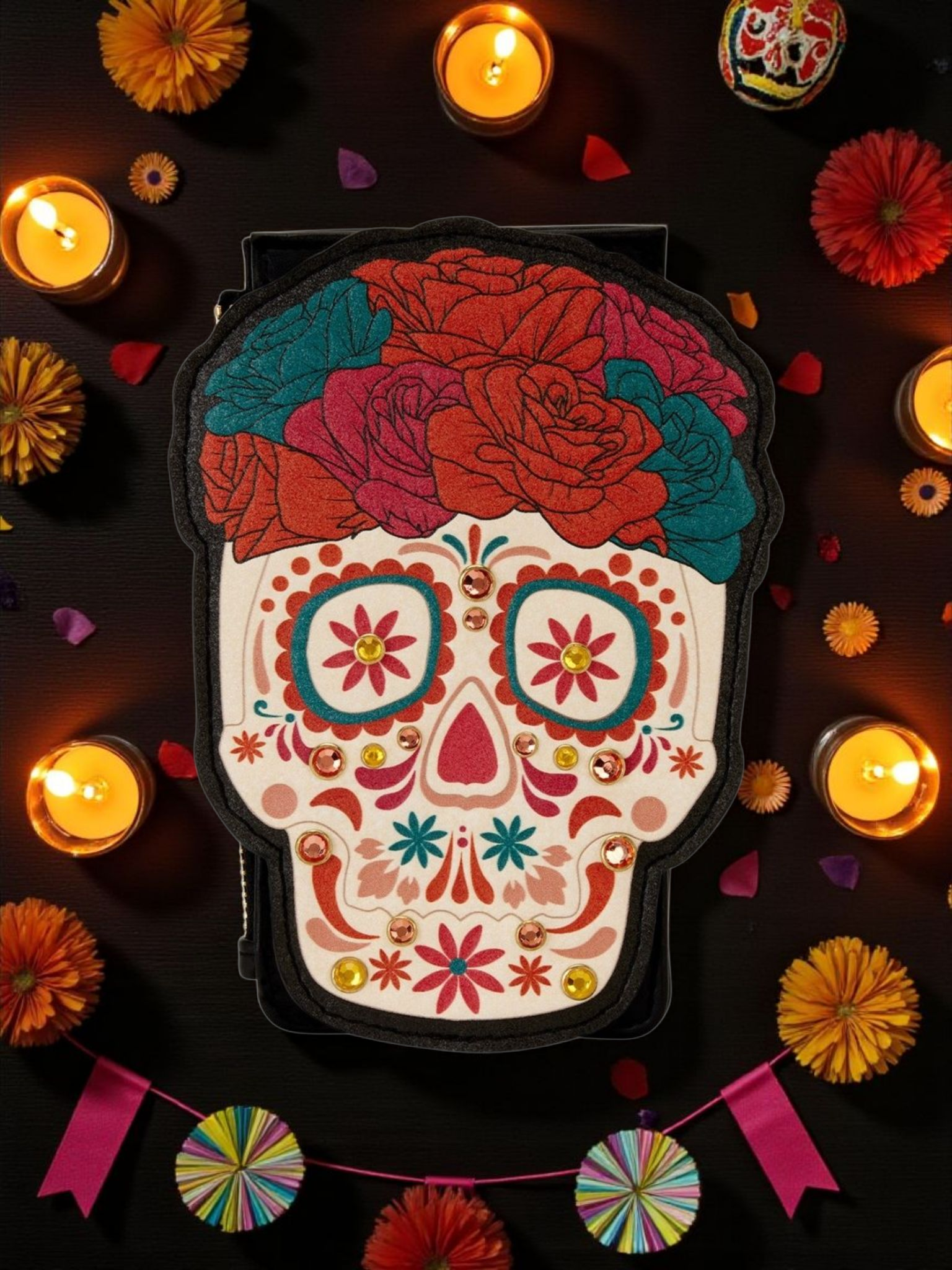 A new accessory to help you celebrate Día de los Muertos! This card holder is in the shape of a skull and features shimmer faux leather, 3D gems, and a design in the traditional art style of Día de los Muertos. Turn it around to find four card slots and a zippered compartment to store essentials. It's a unique piece that makes for a perfect way to honor your loved ones. This is a faux leather card holder that features 4 card slots, 3D gems, an applique, shimmer faux leather and printed details.