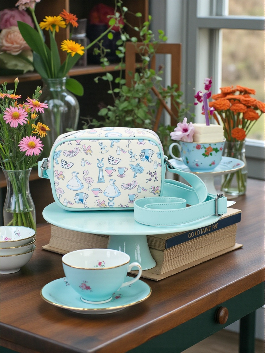 Store all your extra potions and pastries for your next trip to Wonderland in this Alice in Wonderland crossbody bag! Featuring an allover print of Alice's dress, the Mad Hatter's hat, tea cups, playing cards and more. Comes with an adjustable straps and interior zipper pocket.