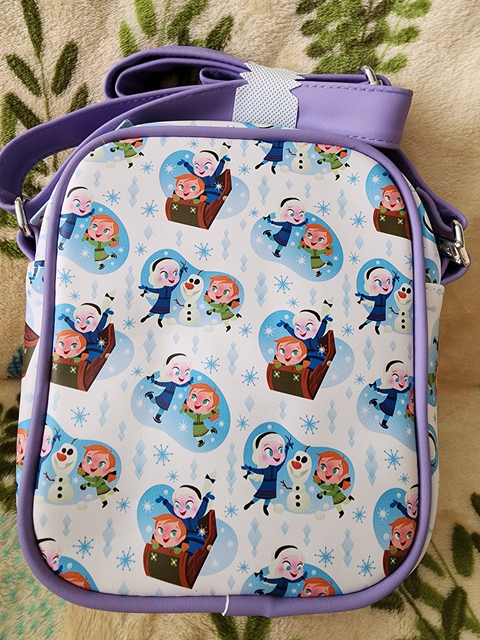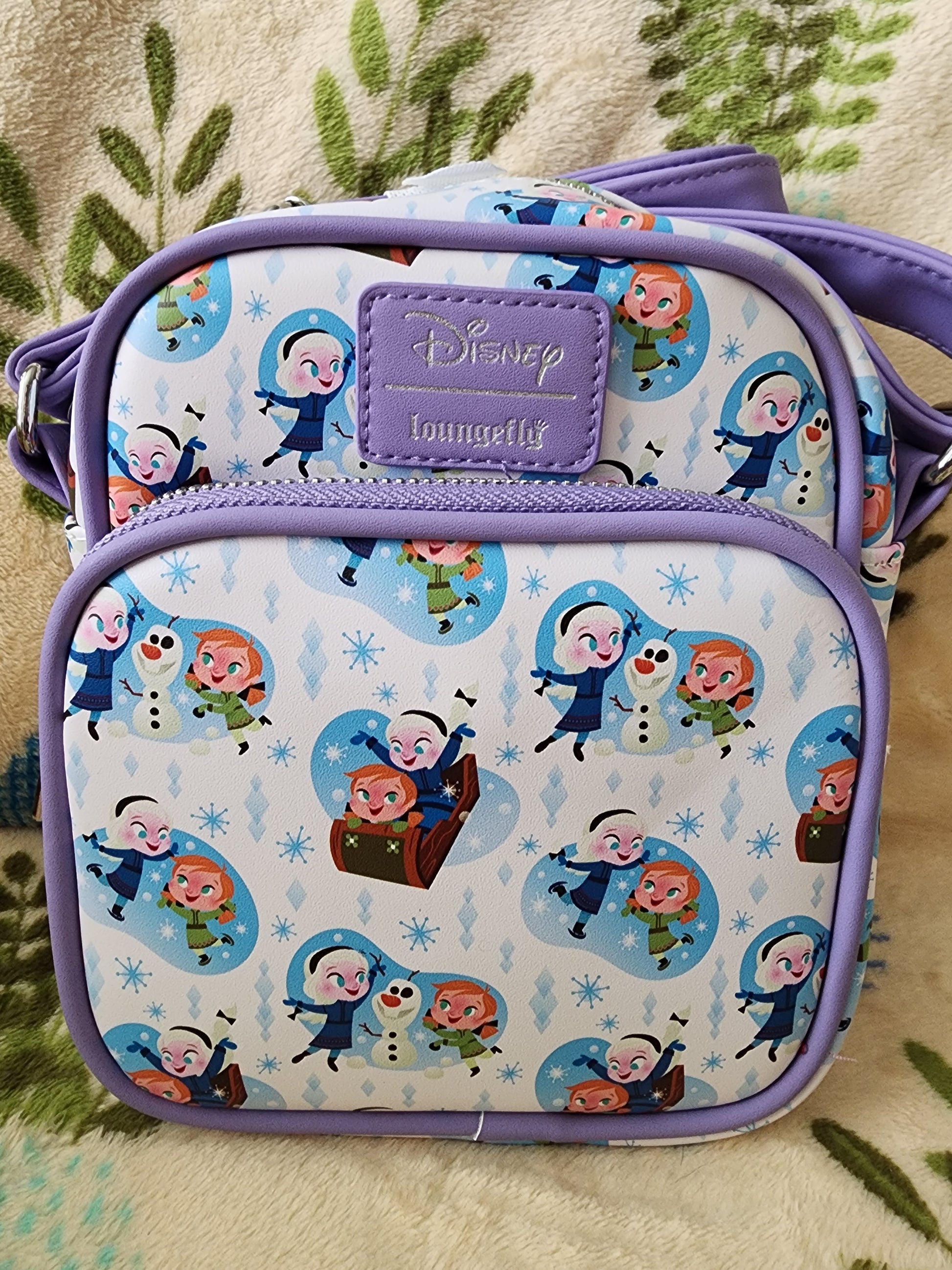 Awesome and super cute Loungefly Disney Frozen Elisa, Anna and Olaf as little kids Crossbody bag. It has 2 zipper compartments with adjustable straps on the back of the bag. Great for everyday use.