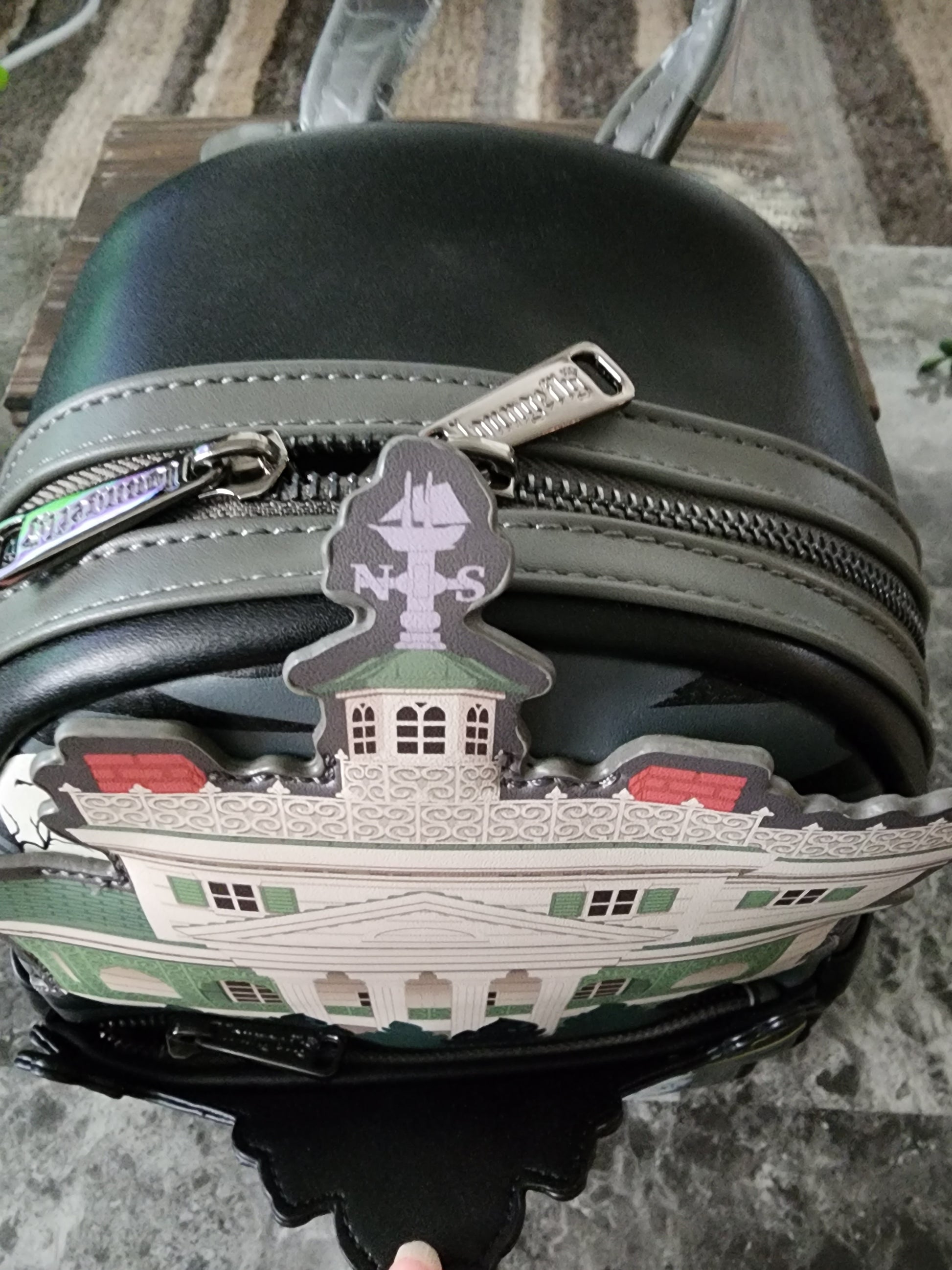 (BoxBB)Awesome Loungefly Disney Haunted Manison Hitchiking Ghosts Backpack. This backpack is amazing it has 2 zipper compartments with adjustable straps on the back. It also glows in the dark. This is a great bag for everyday use.
