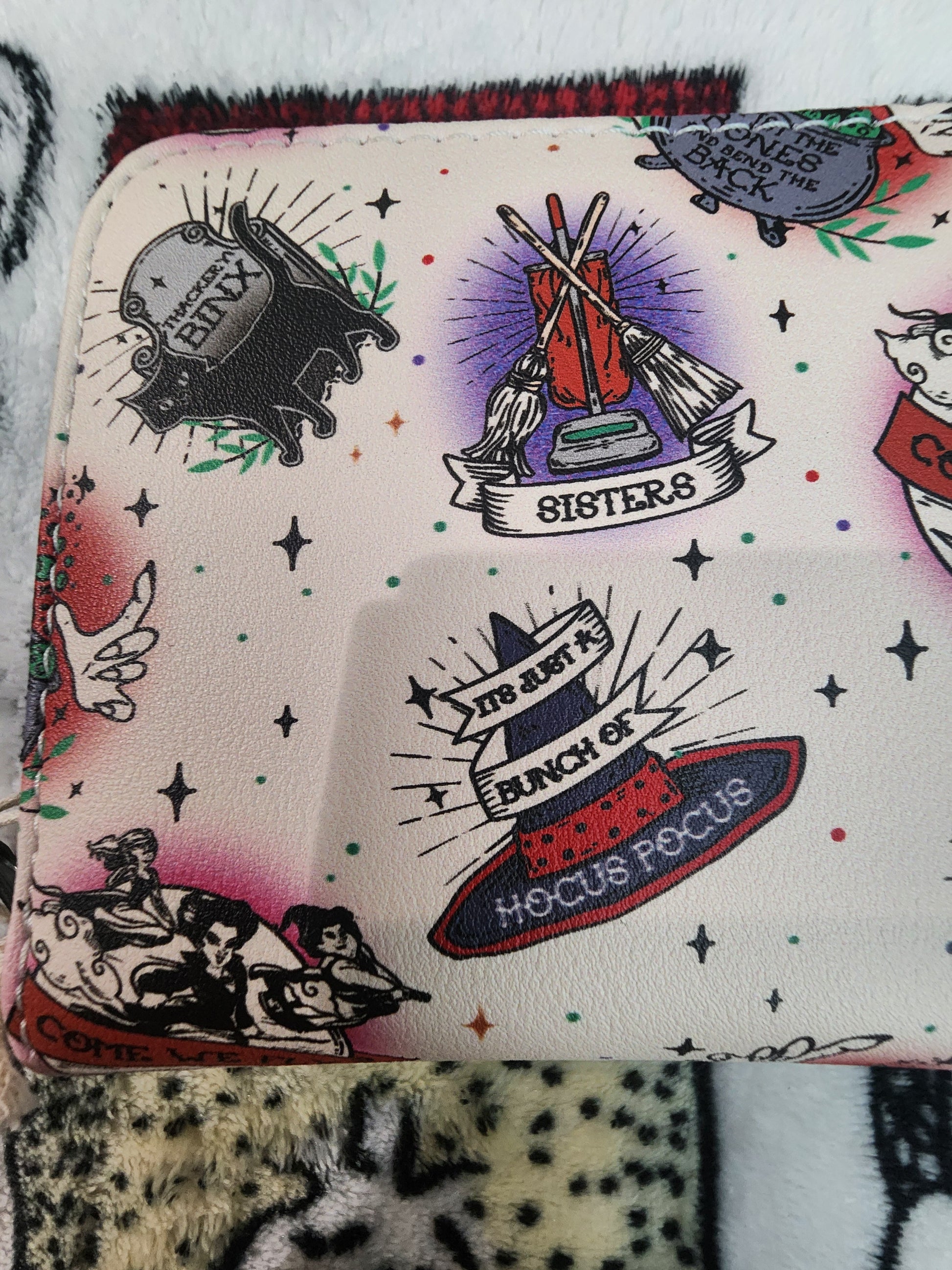 Sistahhhs! Fly through Salem with your witchy essentials in this Hocus Pocus mini zipper wallet! Featuring an allover print of tattoo-inspired designs of Binx's tombstone, brooms, the Sanderson Sisters and other icons from the film. Comes with 5 card slots and a clear ID display.