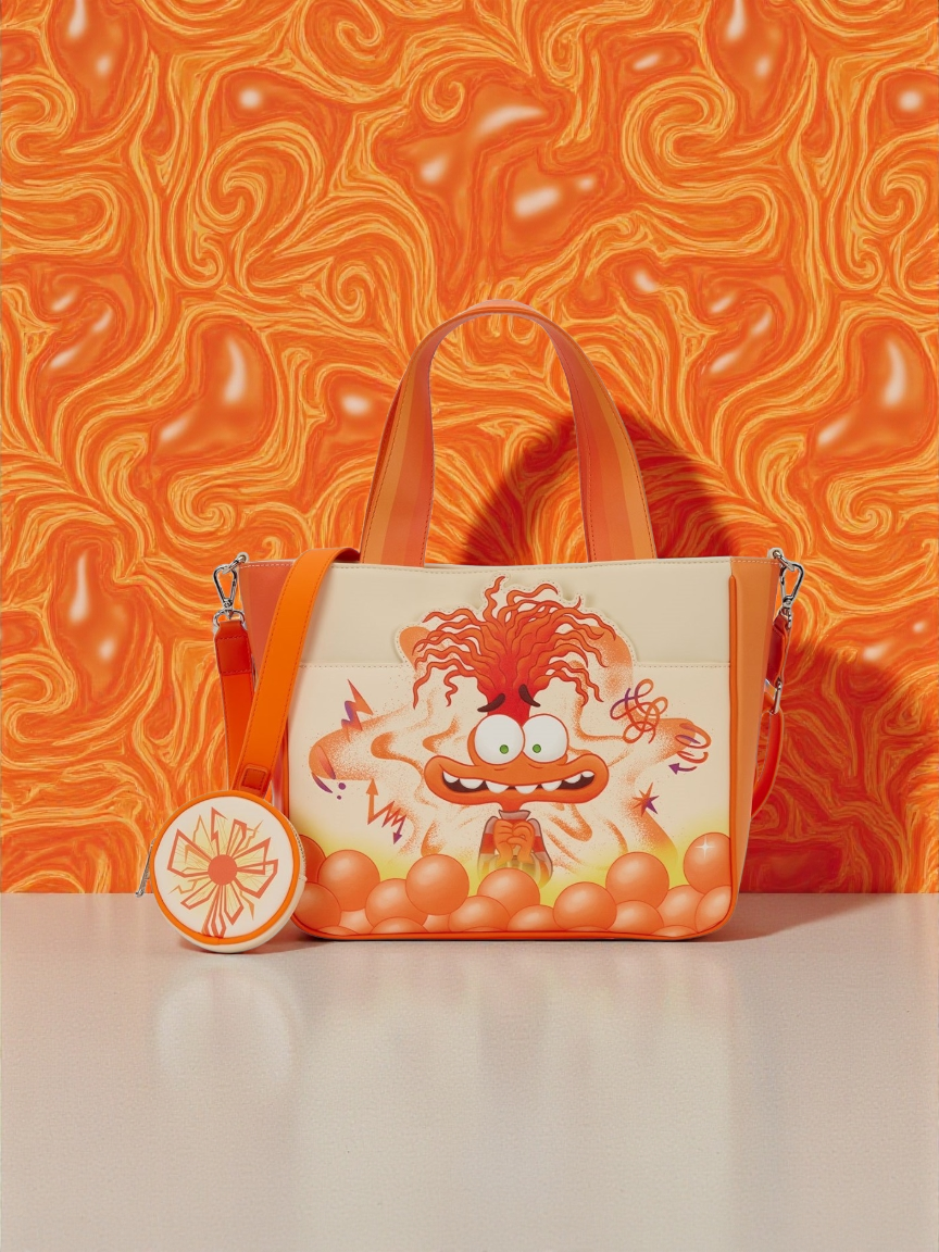 Don't feel anxious about your style! This tote bag is inspired by Anxiety from Disney and Pixar's Inside Out 2. You'll find her front and center on the bag, surrounded by orange memory spheres. Turn it around to find more orange memory spheres and Riley's anxious Sense of Self. Plus, there's a coin bag attached to the strap that features Riley's anxious Sense of Self on one side and Anxiety on the other. This faux leather tote bag features an adjustable crossbody strap, an applique and printed details with a coordinating interior lining!