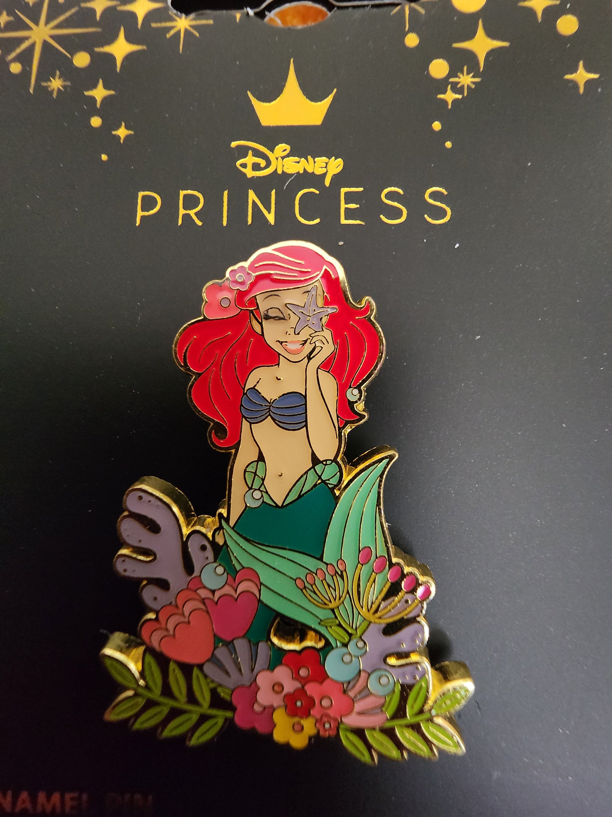Bring the sea to your collection with this Little Mermaid pin! Featuring Ariel posed among flowers, this pin is perfect for adding to your jacket, lanyard, or corkboard.