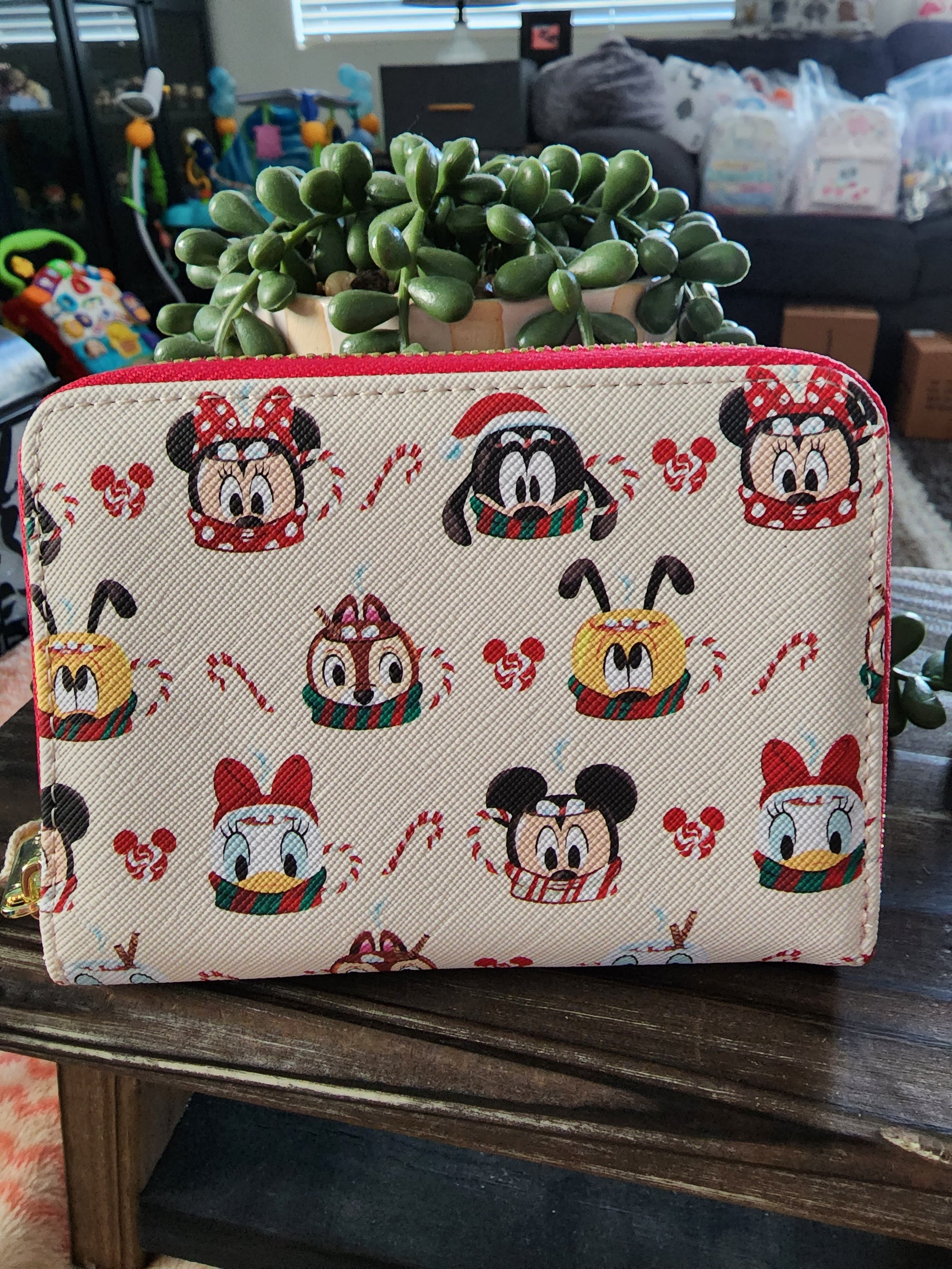 Awesome Loungefly Disney Mickey and Friends Christmas wallet. It has an all around zipper clouser with slots for credit cards and a ID slot. There is a slot for bills