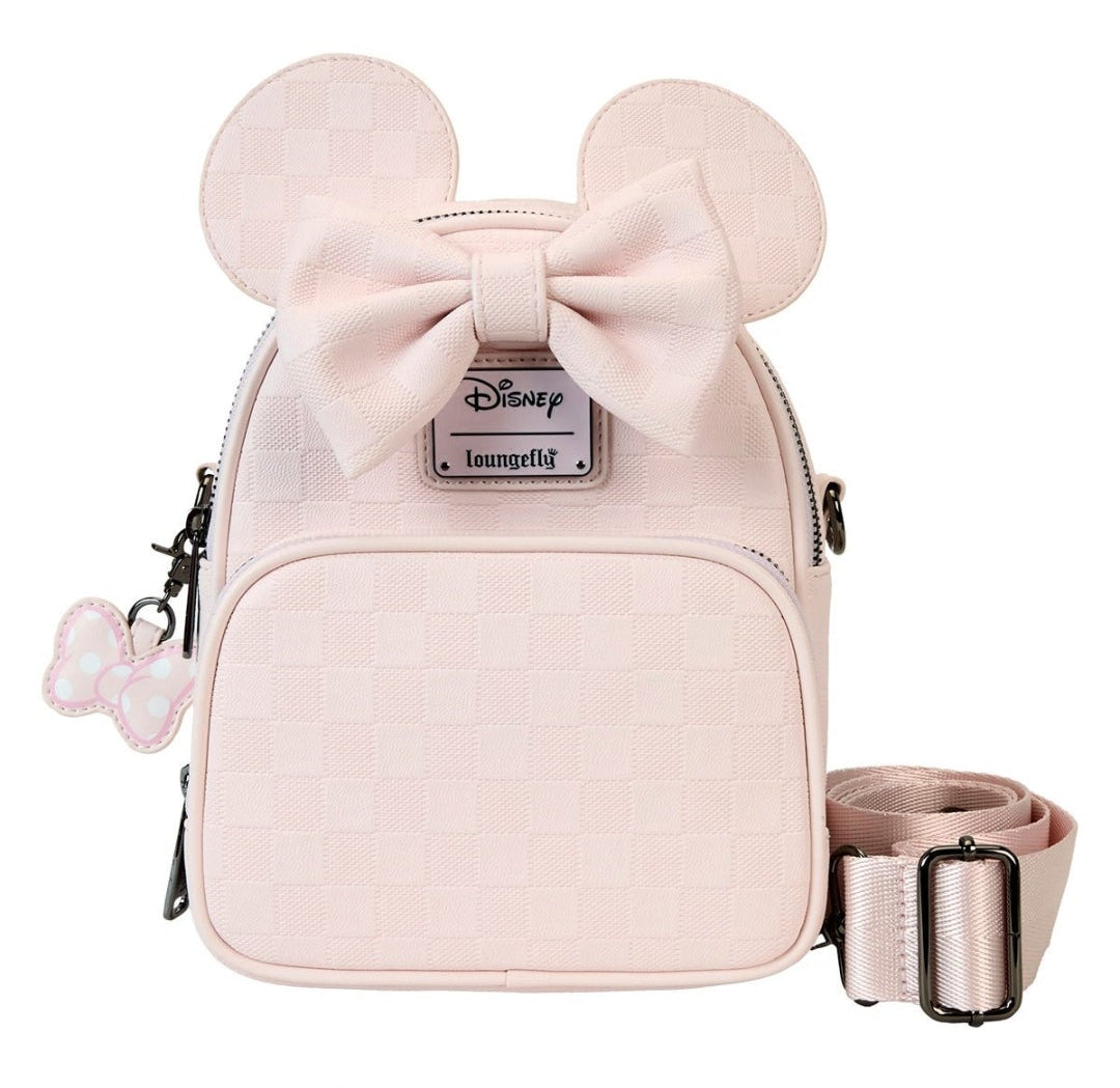 NNN) This Disney Minnie Ear Checkerboard Convertible Crossbody features a crossbody bag with faux leather material, applique, 3-D bow, debossed, and printed details. This convertible crossbody bag measures 8 1/4-inches long x 6 3/4-inches tall x 4-inches deep.