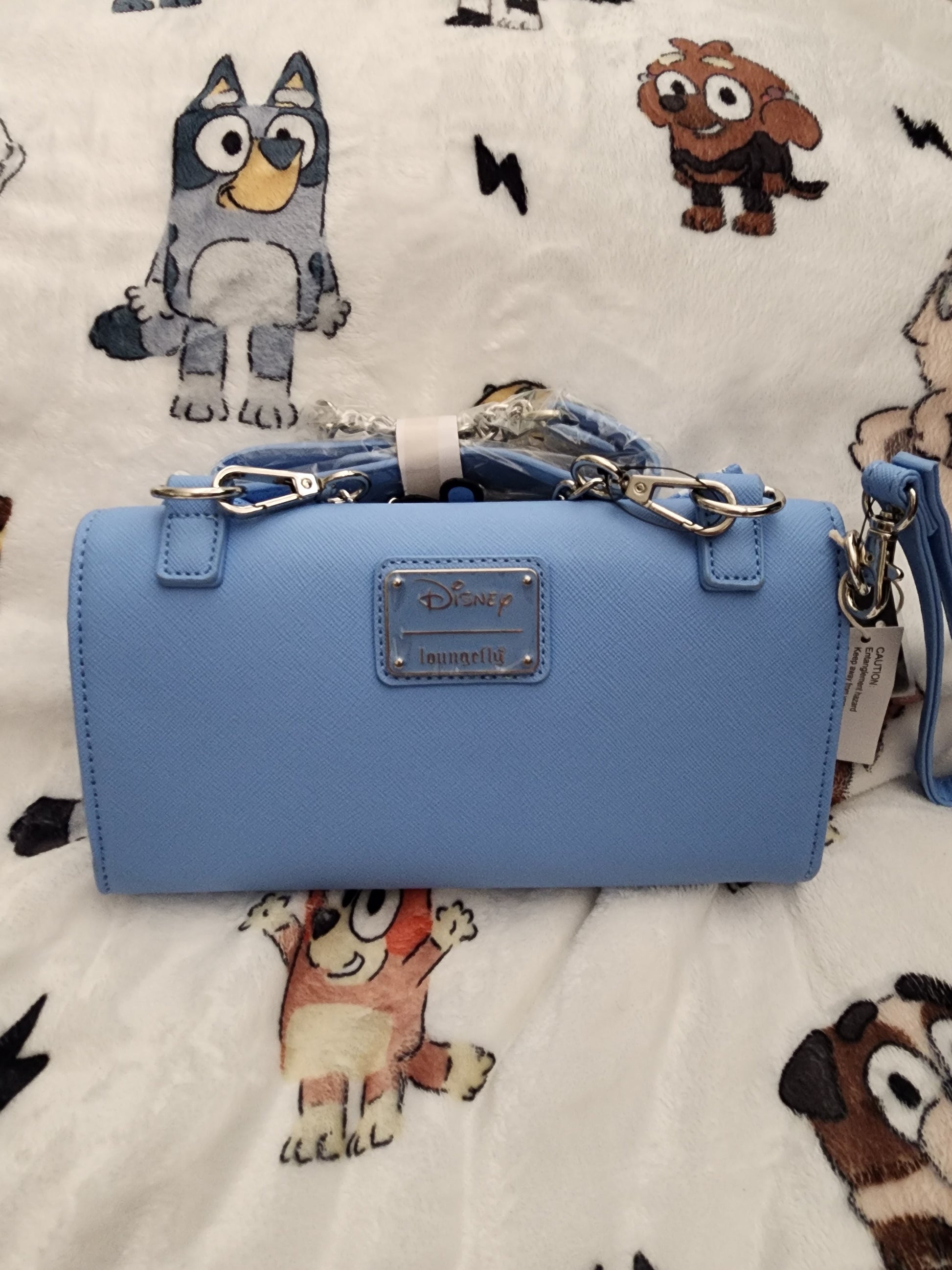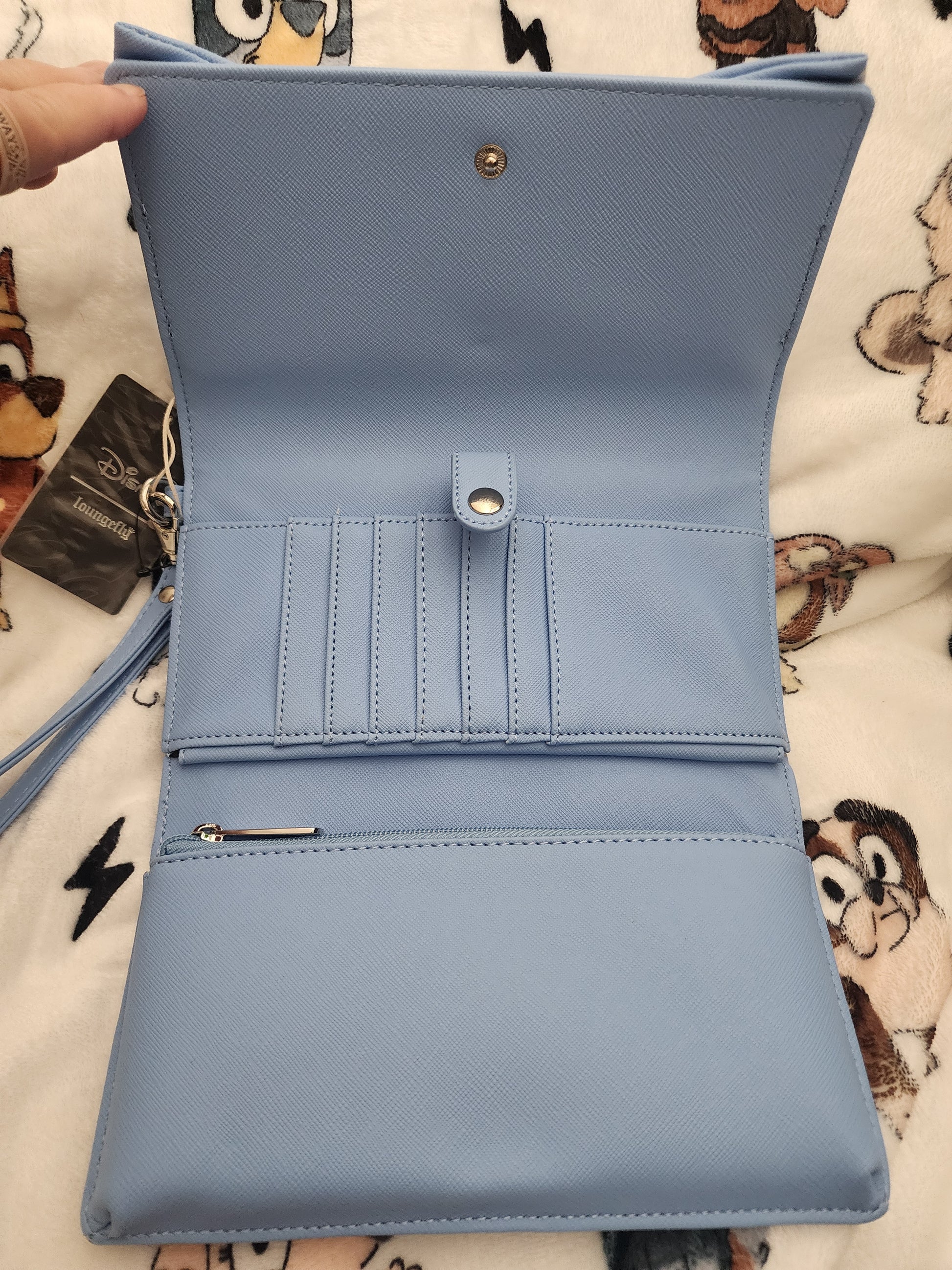 (QI)Awesome and a beautiful bag. Loungefly Disney Minnie Mouse Crossbody Bag/Wristlet. This bag has a snap closure which opens up to a tri-fold bag. It has slots for credit cards and it has a snap strap to hold that section. It comes with a strap and a wristletto carry it by. Rare design and a perfect bag for everyday use.