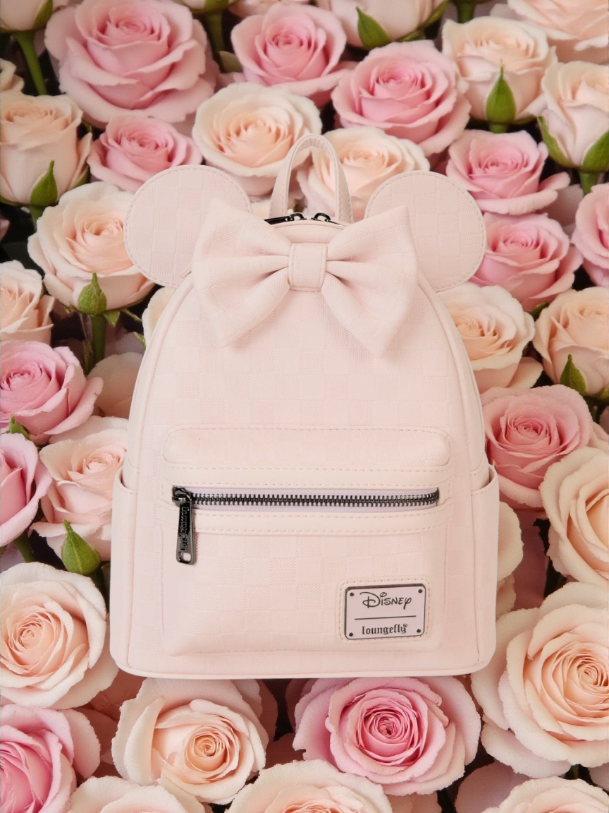NNN) This Disney Minnie Ear Checkerboard Mini Backpack features a mini-backpack with faux leather material, debossed, faux leather charm, and printed details. This backpack measures 10 1/2-inches tall x 9-inches long x 4 1/2-inches deep.