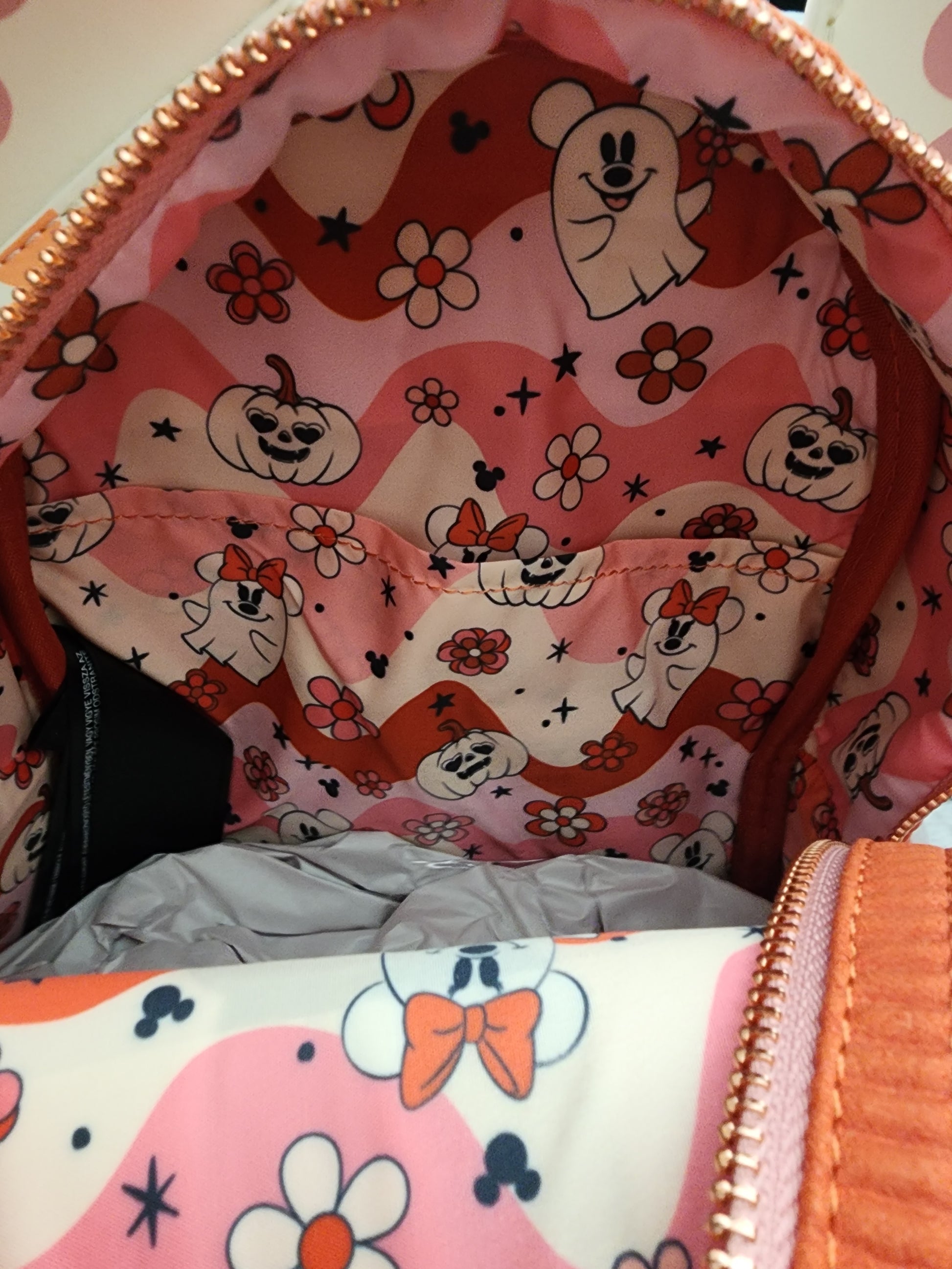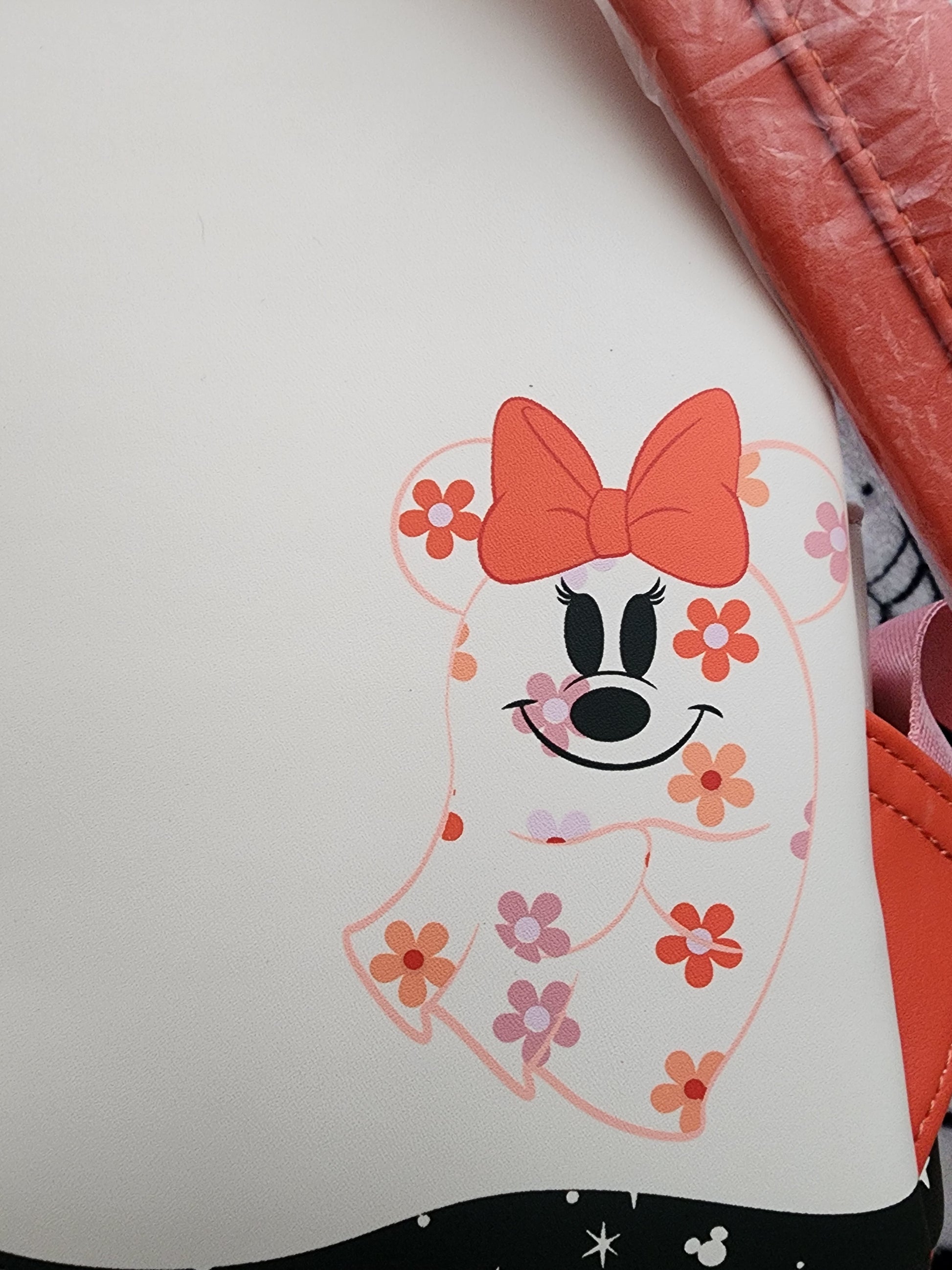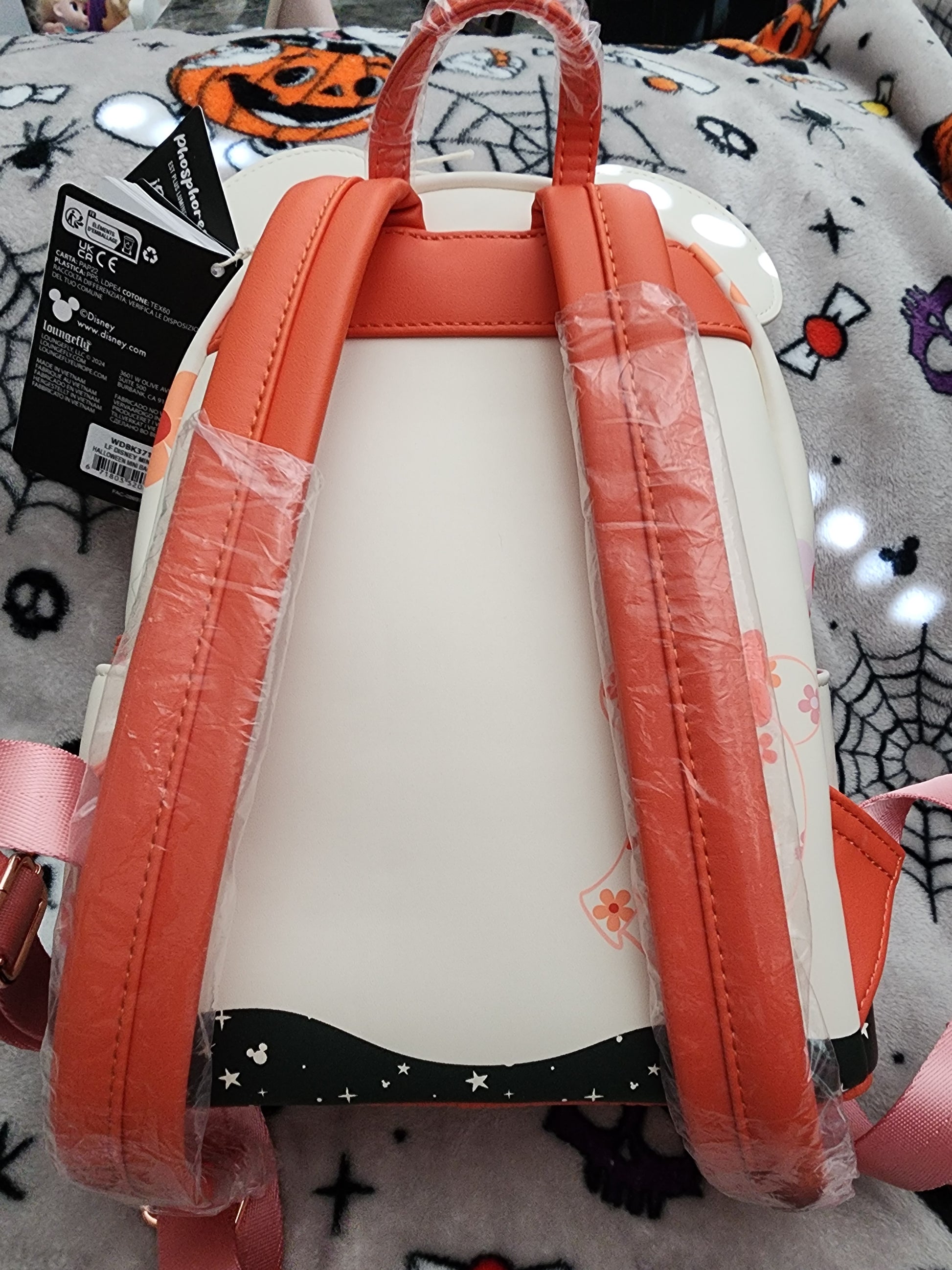 (Qj)Awesome and Super Cute Loungefly Disney Minnie Mouse as a Ghost holding a Pumpkin Halloween Backpack. This bag has 2 zipper compartments with adjustable straps on the back. This bag glows in the dark. Great for everyday use and perfect for the upcoming holidays.