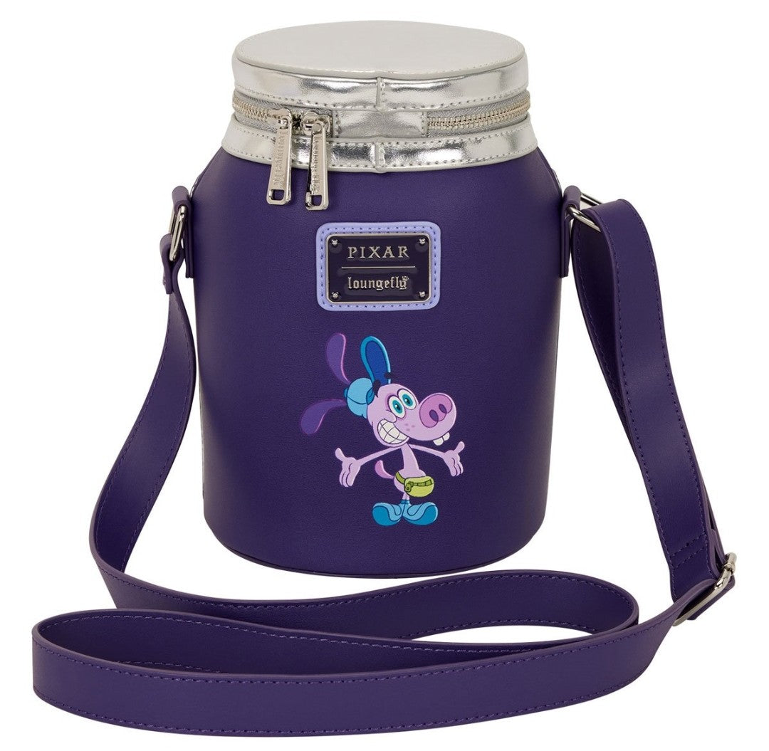 This figural crossbody bag highlights one of the moments of Disney & Pixar's Inside out 2 where Riley's emotions get bottled up and locked away. This bag is shaped like a jar and features Fear, Sadness, Joy, Anger, and Disgust "bottled up." On the back, you'll find an illustration of Bloofy with Pouchy. Metallic material on the lid gives it extra shine. This bag is perfect for any fan of Inside Out!