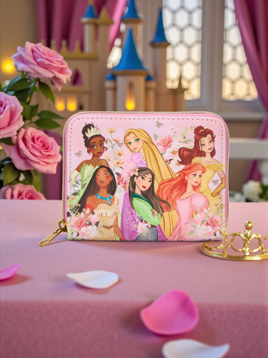 Think pink with your favorite Disney heroines! This mini wallet features a floral print and your favorite Disney princesses, Tiana, Rapunzel, Belle, Pocahontas, Mulan and Ariel! Comes with 4 card slots, clear ID slot and zipper closure.