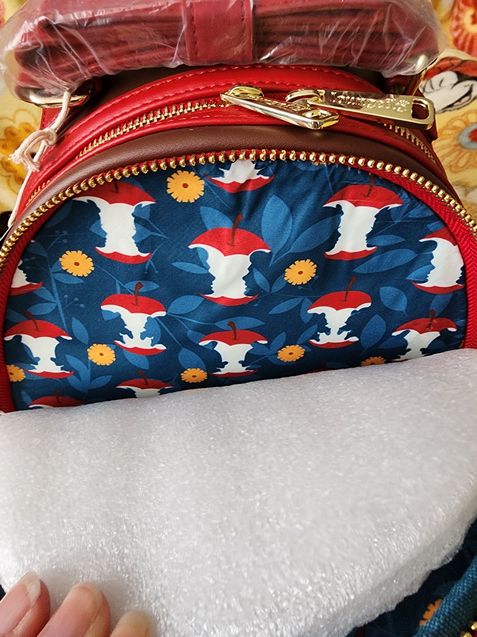 Q4) Awesome Loungefly Disney Snow White with the Apple Backpack. It has 2 zipper compartments that can hold a lot of items. It has dark red velvet pockets on the sides and adjustable straps on the back. Great backpack for Snow White fans.