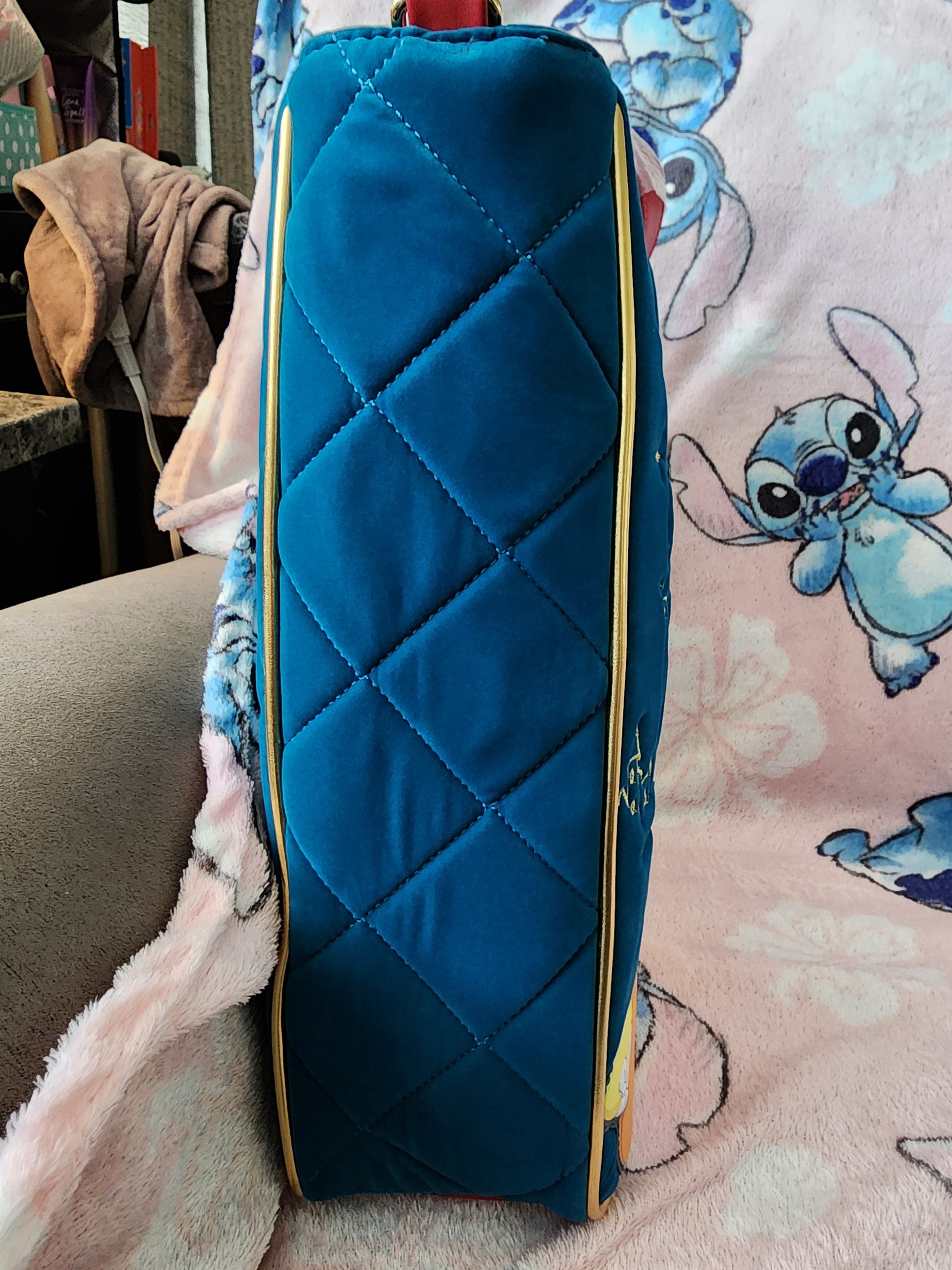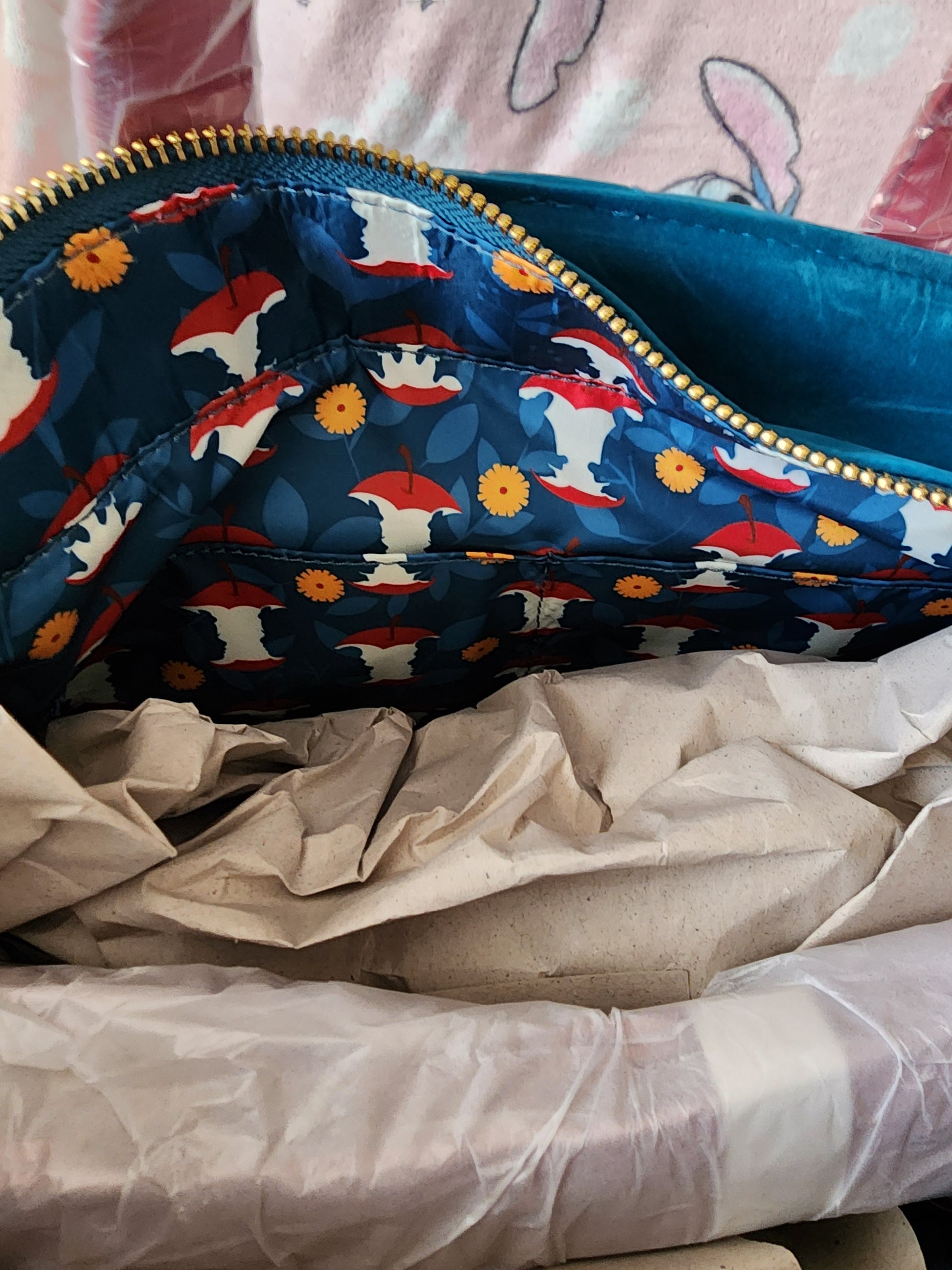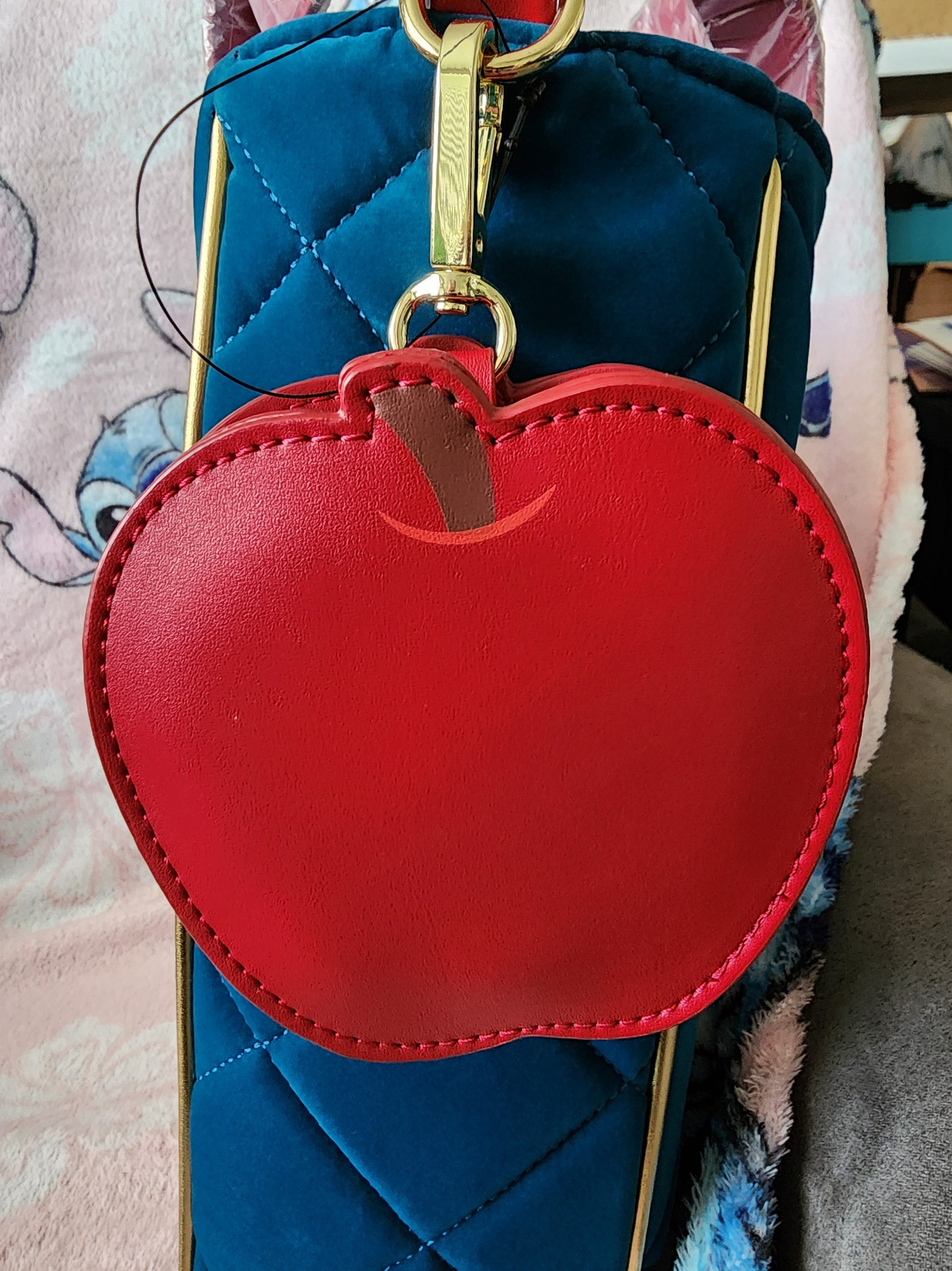 AB) This is an awesome bag. It is a Loungefly Disney Snow White Tote Bag. This is the new Loungefly design. It has a soft velvet material on the outside. It comes with 2 handles to carry it by and also an adjustable strap. It has pockets and a nice design on the inside of the bag. There is an apple shaped coun purse, or it can be used for other things attached to the side of the bag and can be removed if you like. This bag is perfect for a table or laptop and would be great for travel. It has a zipper closure to keep everything secure. Great for everyday, school and travel.