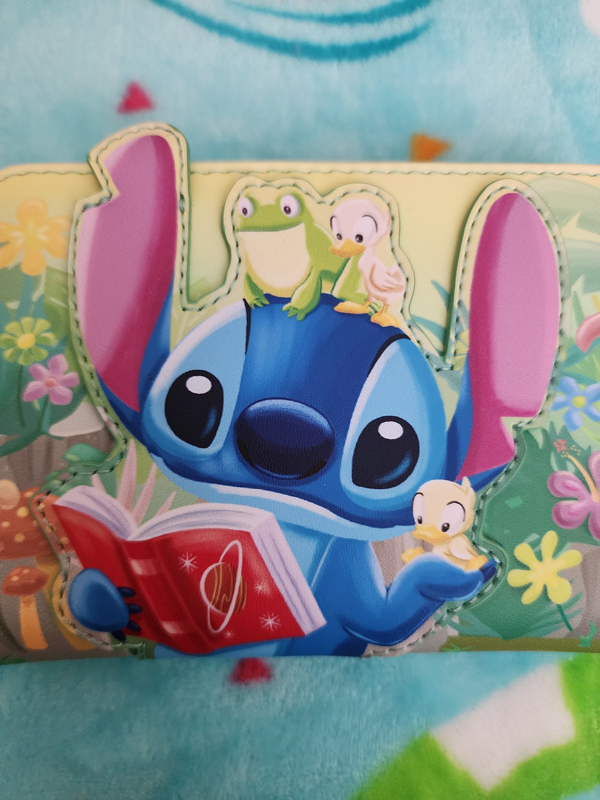 Awesome and Super Cute Loungefly Disney Stitch and Ducklings Reading Book Exclusive Wallet. It has a zipper closure with slots for credit cards and an ID slot inside. There is also a slot to put cash. This wallet is great for everyday use.