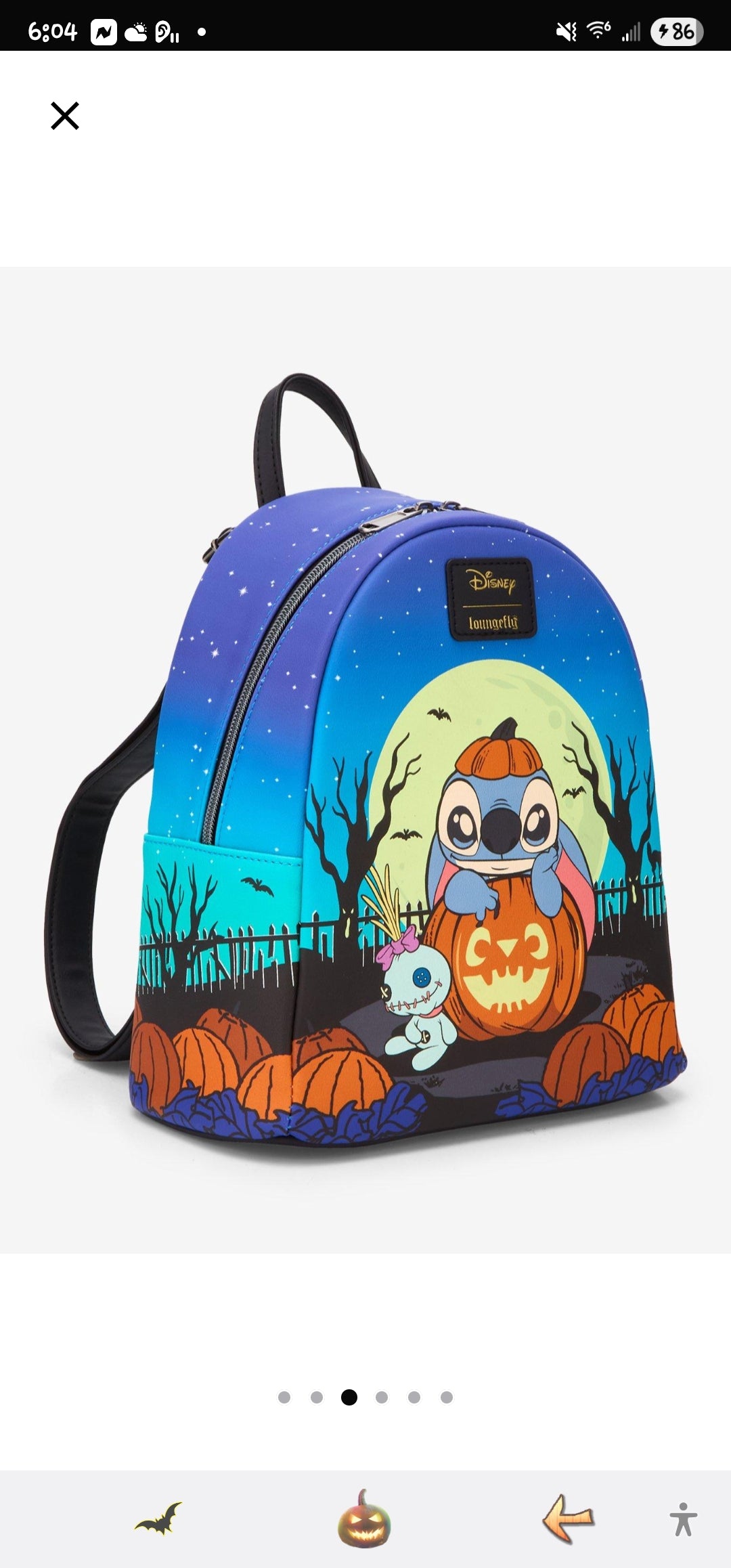 Bella) Go trick-or-treating with your ohana with the perfect Stitch mini backpack! It features an image of Stitch in a jack-o'-lantern and Scrump sitting next to him, plus glow-in-the-dark details. Comes with interior drop pocket.