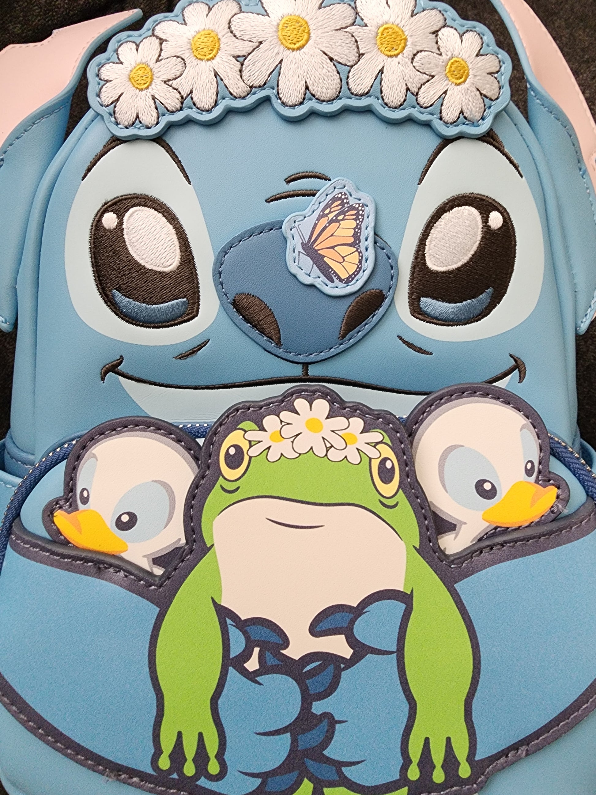 AC) Awesome and Super Cute Loungefly Disney Stitch Floral Backpack. It has Stitch on the front holding a Frog and the Ducklings. The backpack had 2 zipper compartments and adjustable straps on the back. This backpack is great for everyday use and perfect for Stitch fans.