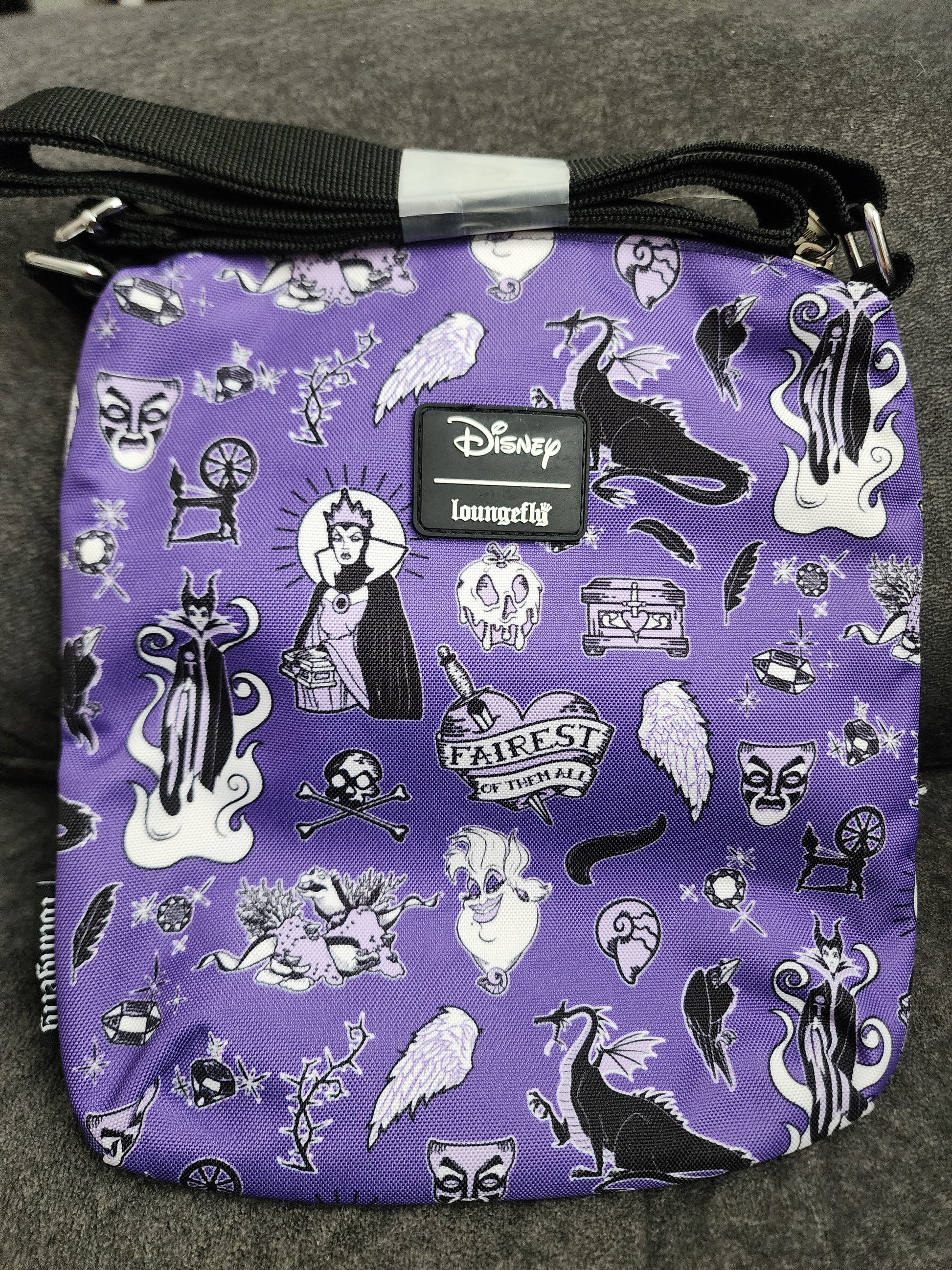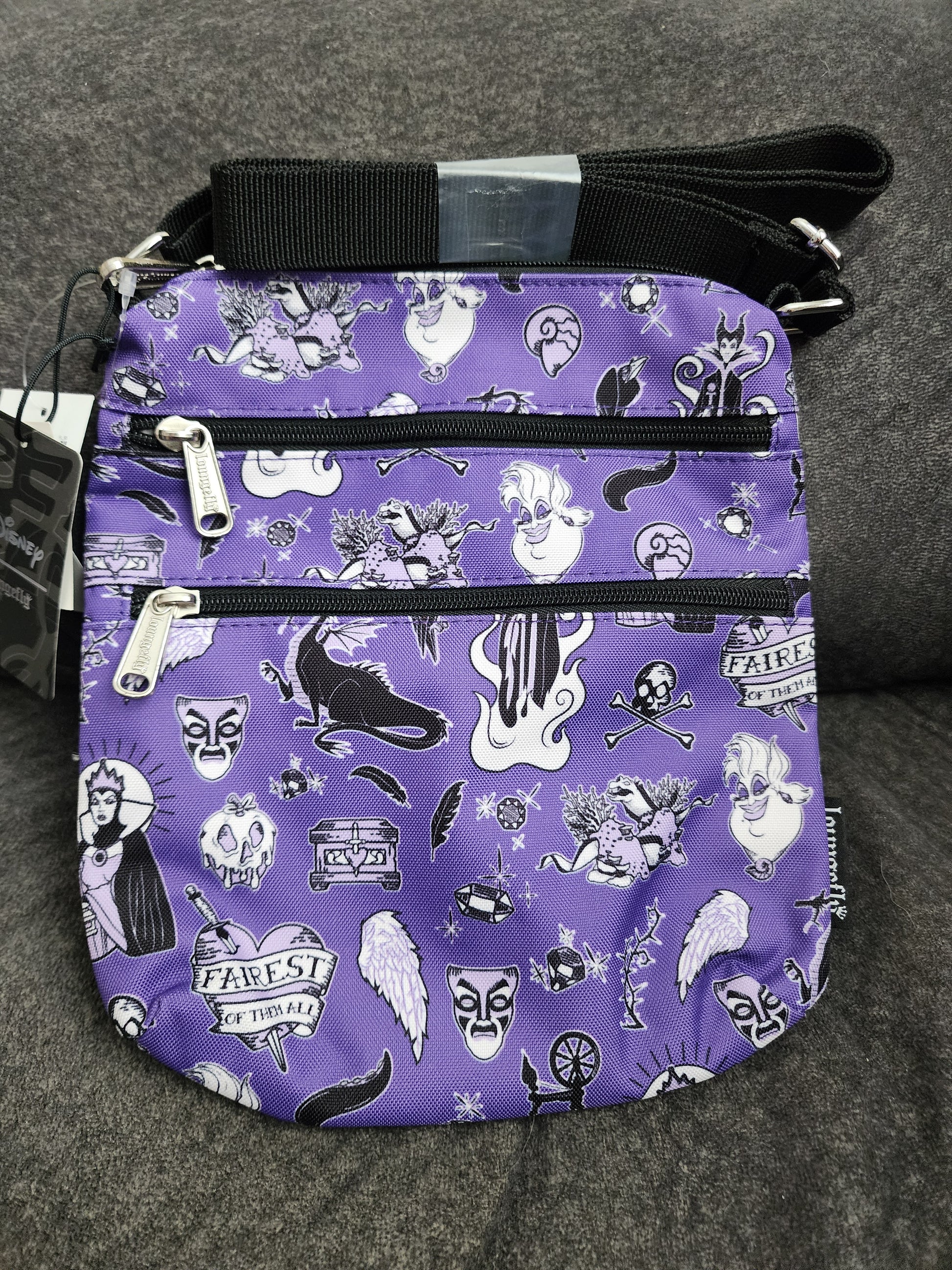 Awesome and Super Cool Loungefly Disney Villains Icon Crossbody Bag. It has 3 zipper compartments, and it comes with an adjustable strap. Great for the upcoming holidays.