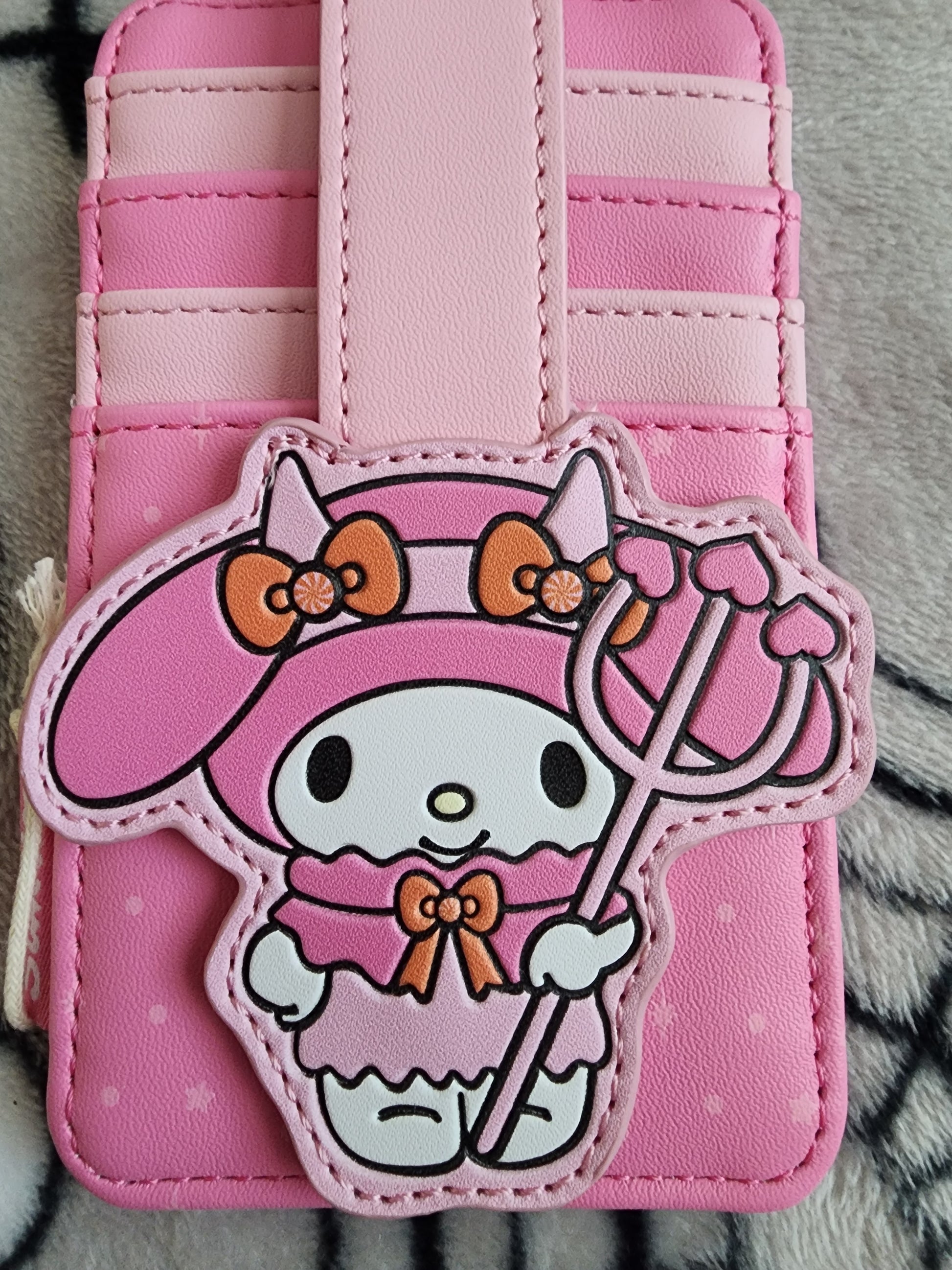 Awesome and Super Cute Loungefly Hello Kitty My Melody as a Cute Devil Snap Card Holder. It has slots for credit cards and an ID slot on the back. Great for everyday use and perfect for the upcoming holidays.