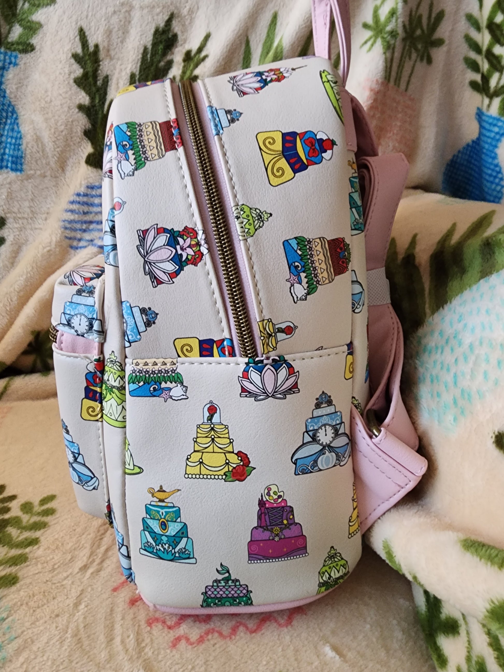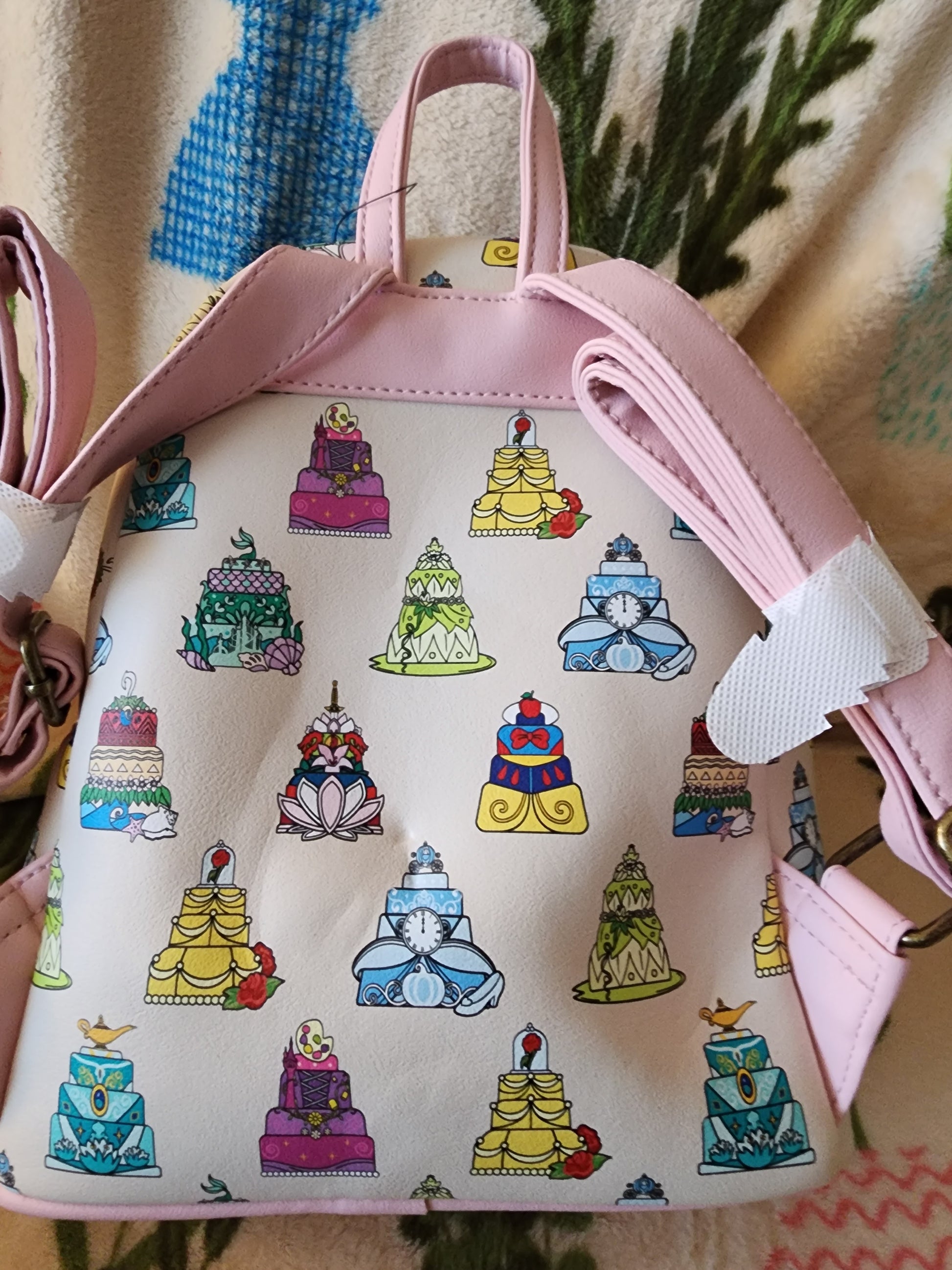 (Z)(2BB)Awesome Loungefly Disney Princesses Cake Backpack. It has 2 zipper compartments with adjustable straps on the back. There is a Snow White, Cinderella, Mulan, Moana, Frog Princess,Jasmine and Ariel cakes that looks like their dresses. Great for everyday use.