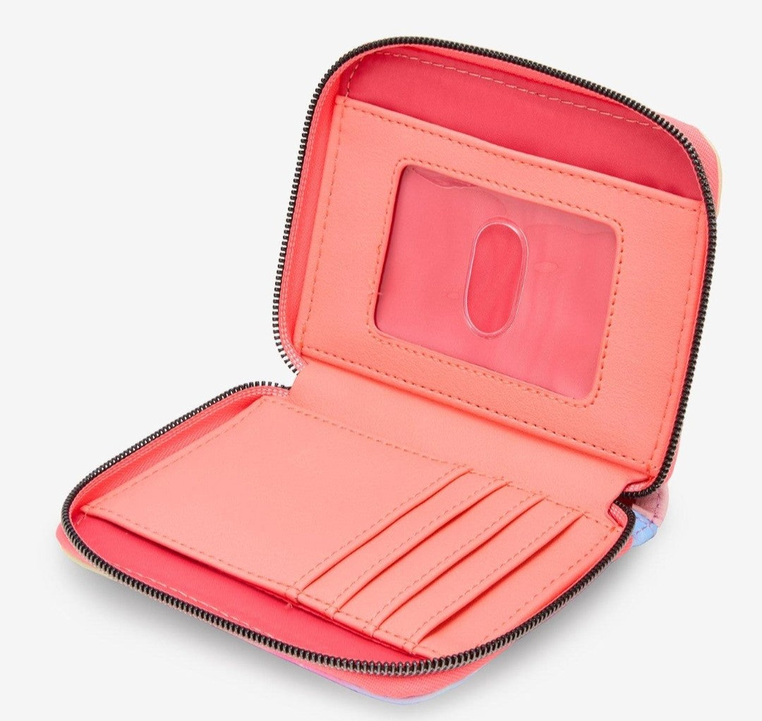 Pack your essentials into a magical mini wallet! This Sanrio zipper wallet features a whimsical galaxy of stars, bows and hearts, with Hello Kitty and Tiny Chum posing together in a sweet outfit. Comes with 4 card slots, clear ID slot and zipper closure.