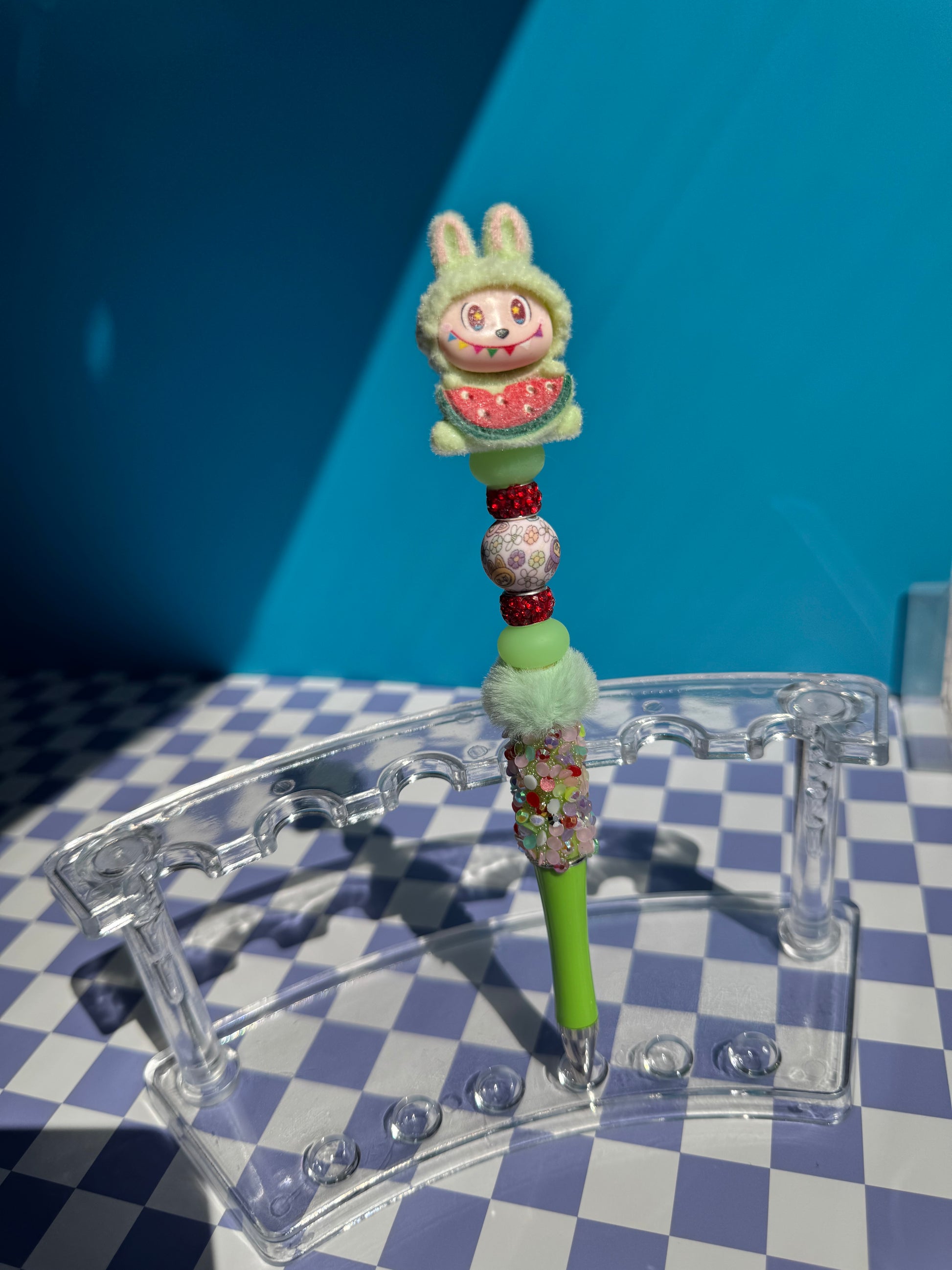 All pens are plastic ballpoint pens with black refillable ink, retractable by twisting. All pens are created with fancy beads inspired by your favorite Disney characters and topped with a Flocked Watermelon Labubu!