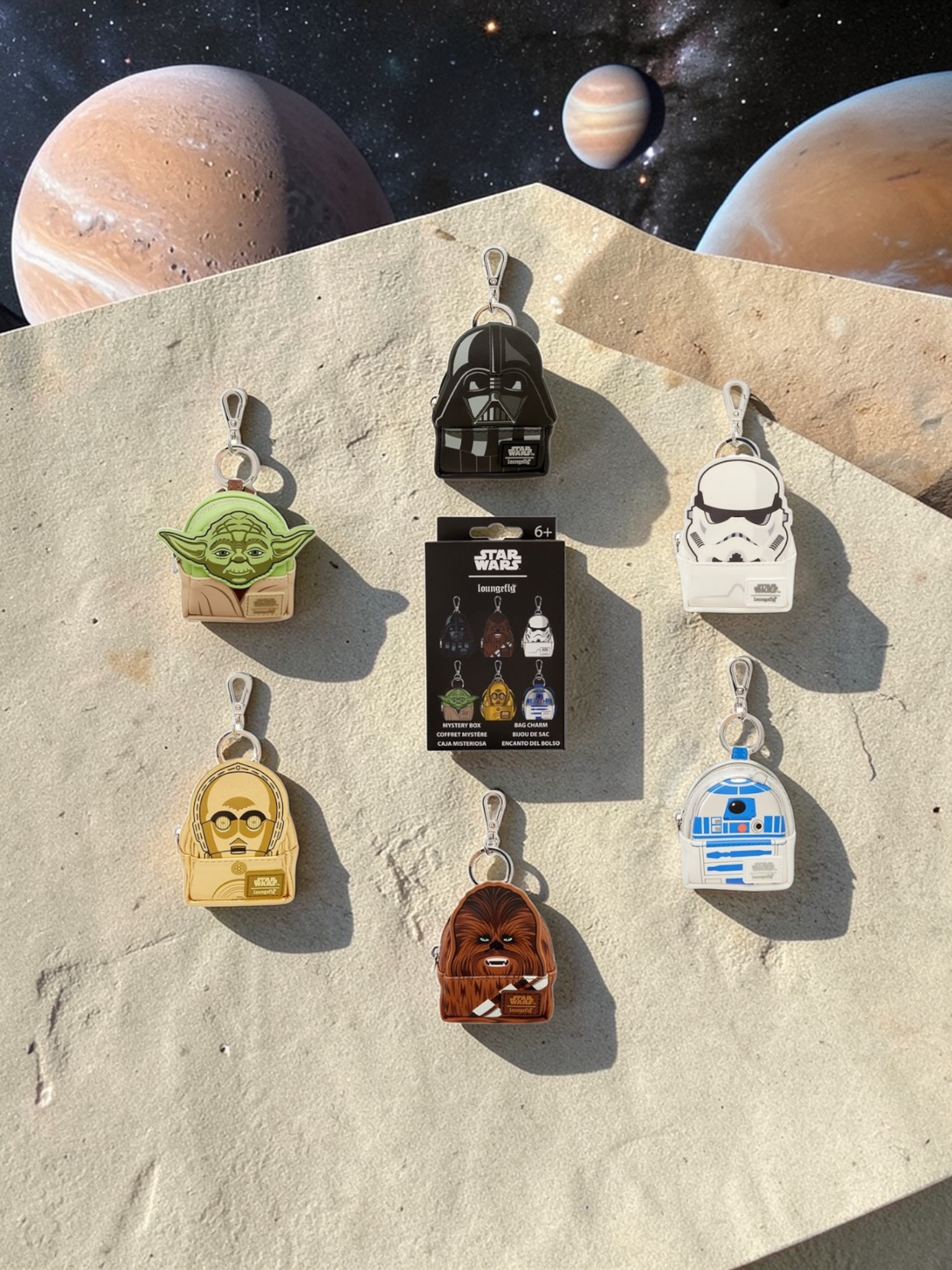 The best accessories in the galaxy! These mystery mini-backpack keychains come individually wrapped, so you don't know which you'll get! There are six in total to collect: Darth Vader, Chewbacca, R2-D2, Yoda, C-3PO, and a Stormtrooper! Collect them all and then accessorize your accessories! The cute and collectible key chains each measure approximately 3-inches tall x 2 1/4-inches long x 1 1/4-inches wide.
