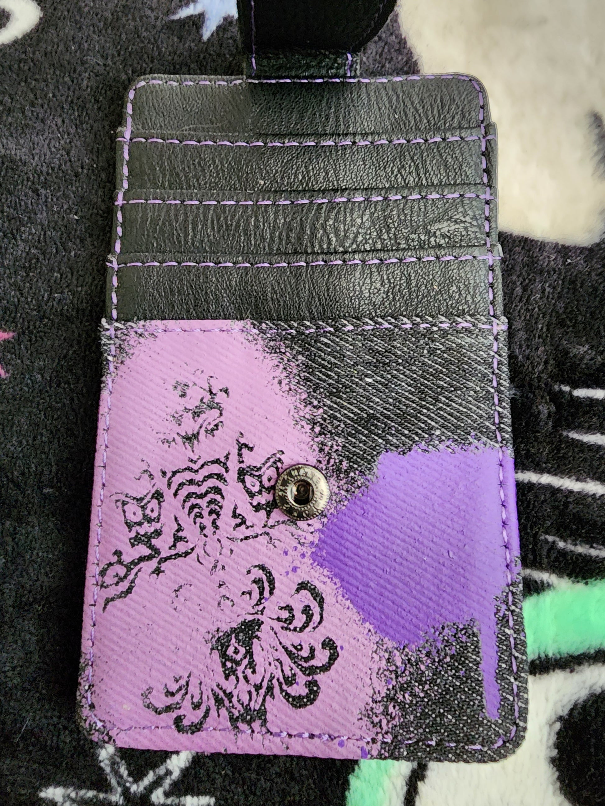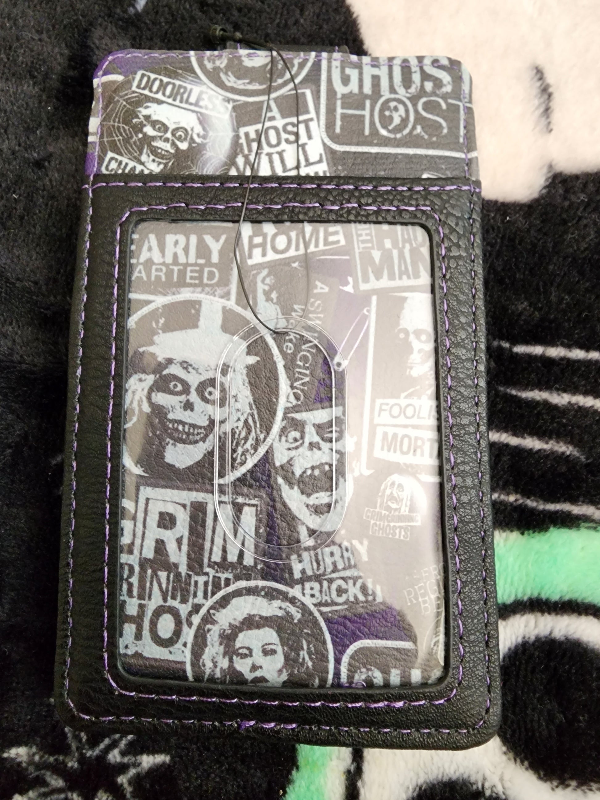 Awesome and cute Loungefly Disney Haunted Mansion Hatbox Ghost card holder. It has a snap closure with the center of the snap that is holographic. There are slots for credit cards and an ID slot. It is great for everyday use.