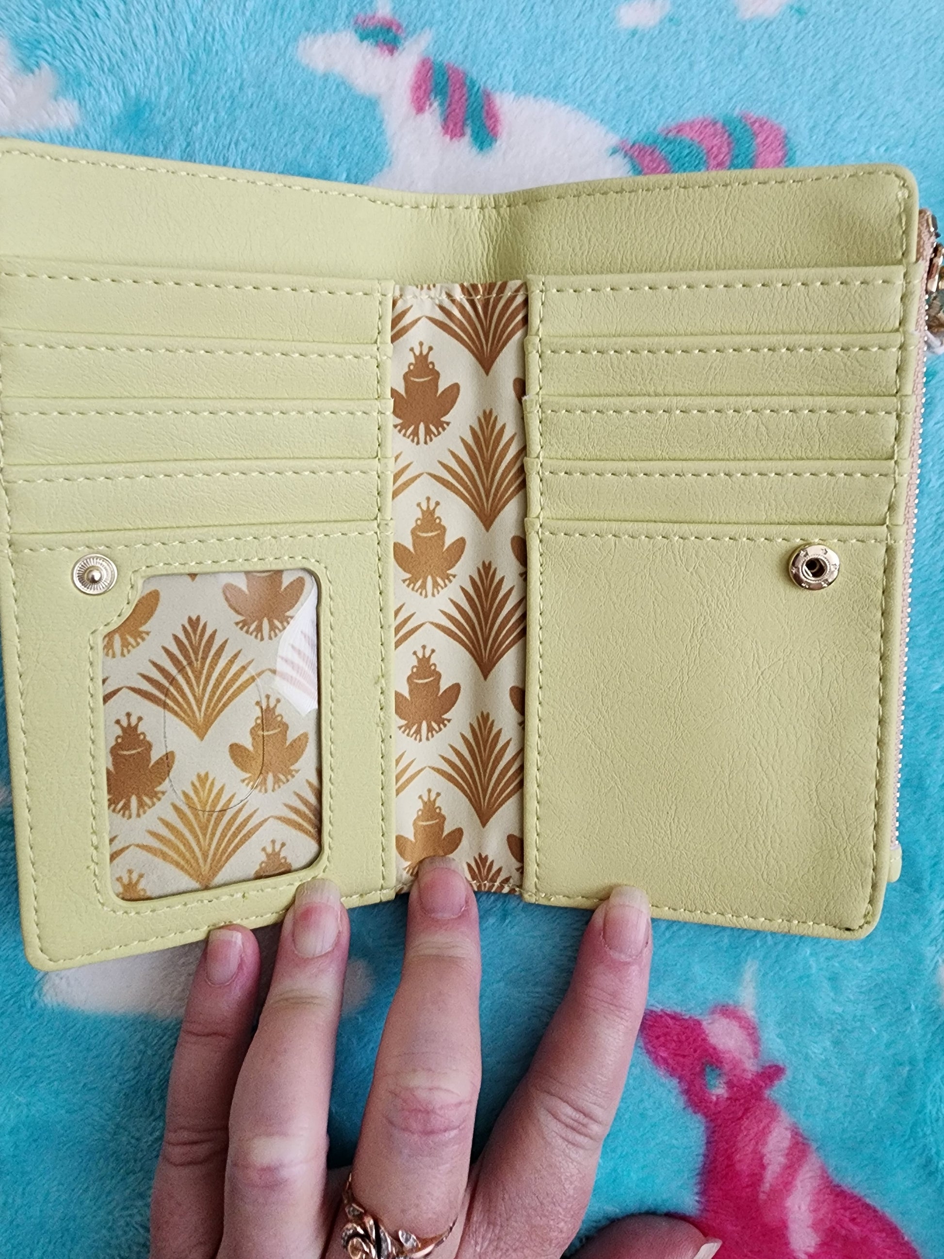 Awesome Loungefly Disney The Frog Princess Wallet. It has a snap closure with slots for credit cards and an ID slot. There is a zipper compartment on the back of the wallet. It is great for everyday use.