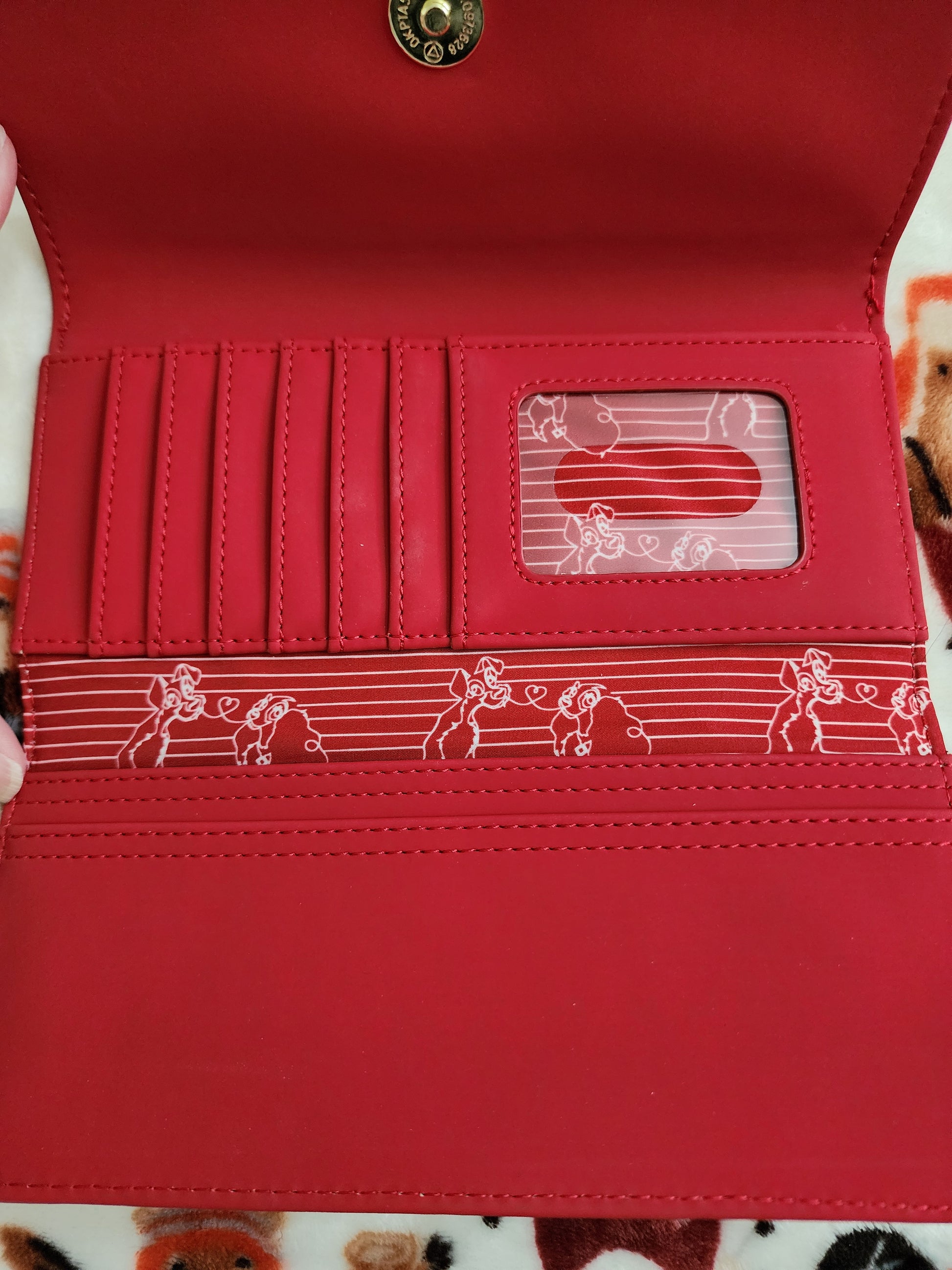 Awesome cute and Loungefly Disney Lady and the Tramp snap closure Tri-fold wallet. It has slots for credit cards, ID slot and a large slot for bills. There is a zipper compartment on the back of the wallet for coins. Great for everyday use.