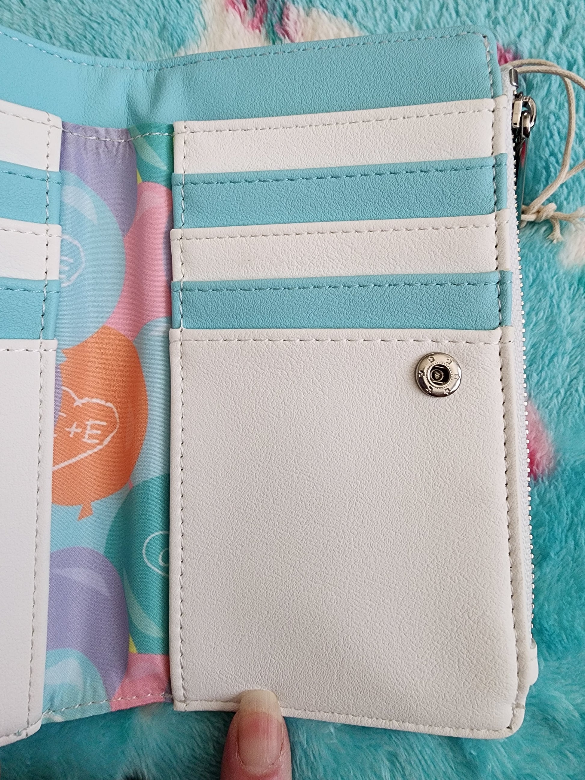 Awesome Loungefly Disney Pixar Up Wallet. It has a snap closure with slots for credit cards and an ID slot. There is a large slot for bills on the side of the wallet. There is a zipper compartment on the back of the wallet for coins. It is great for everyday use.
